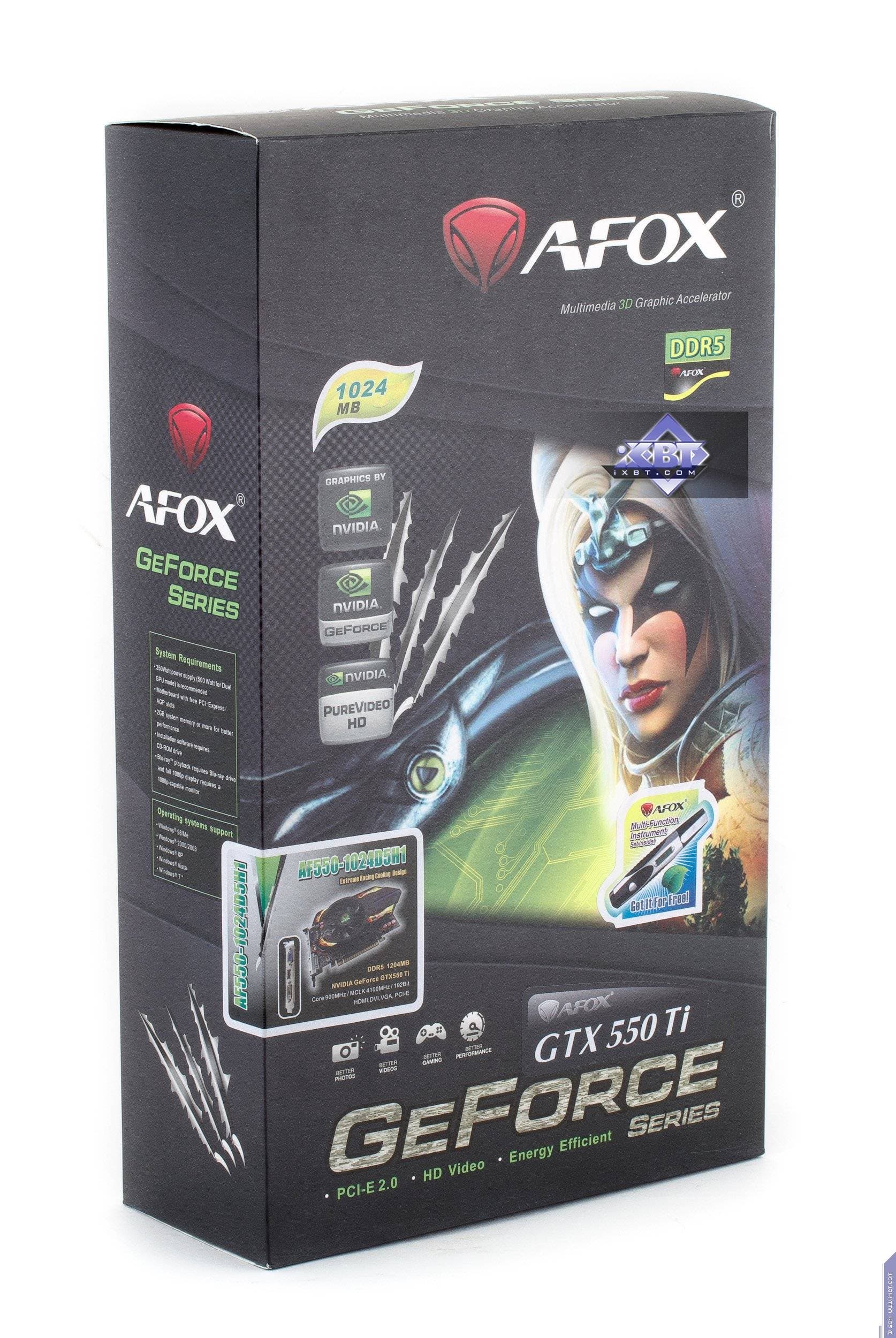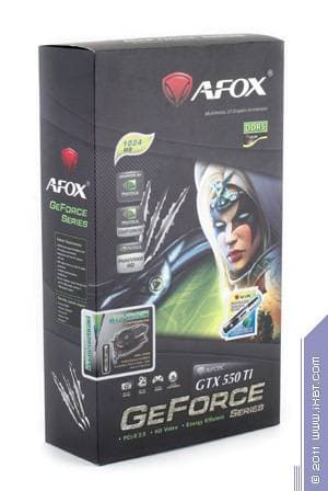 AFox Geforce GTX 550 Ti 1024 МБ 192-битной GDDR5 PCI-E (AF550-1024D5H1) — хорошее исполнение (вариация) GTX 550 Ti. Карта имеет относительно небольшие размеры, хотя и занимает два слота в системном блоке. Эффективно работающий кулер удачно дополняет картину.