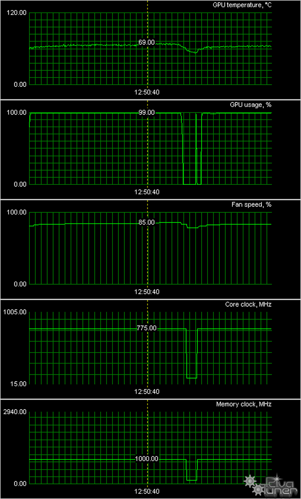 Мы провели исследование температурного режима с помощью утилиты MSI Afterburner (автор А. Николайчук AKA Unwinder) и получили следующие результаты: