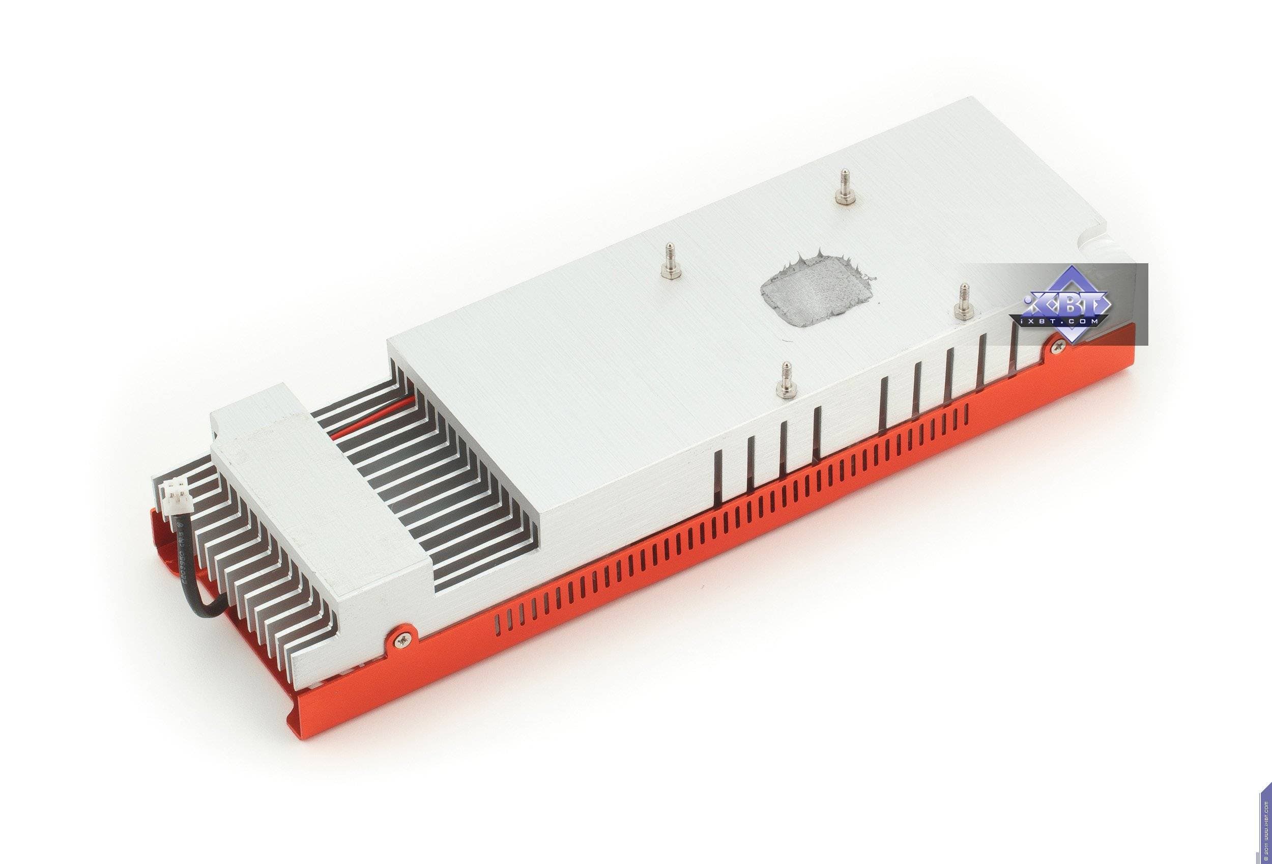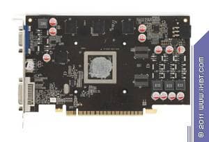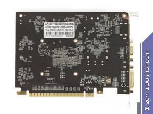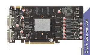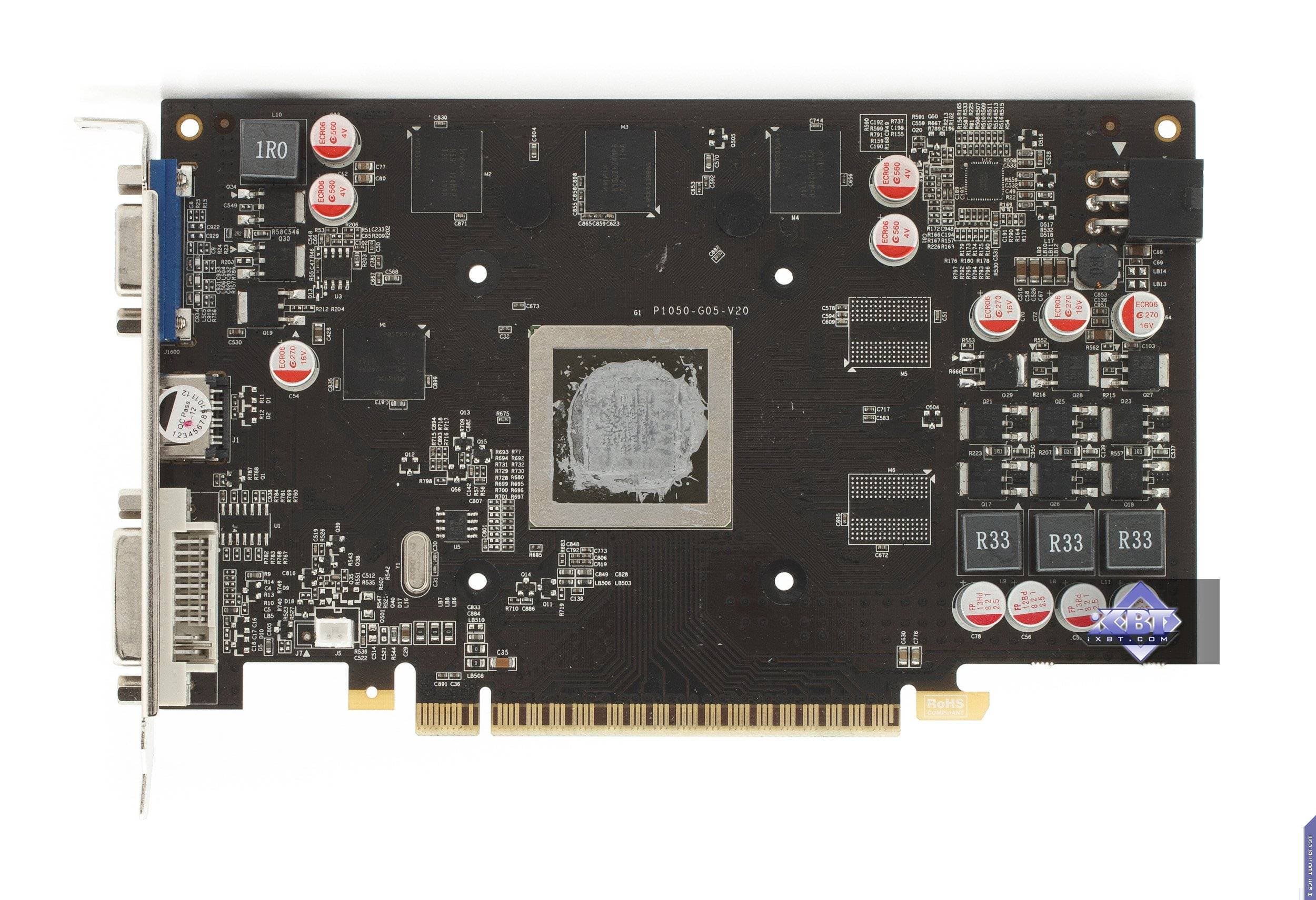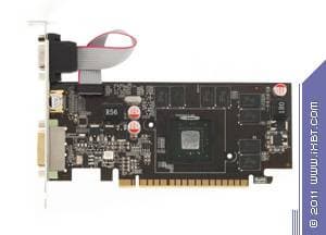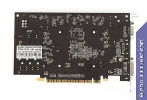 Далее идет Geforce GTS 450. Как мы видим, дизайн если и отличается от эталонного, то ненамного. И точно так же он базируется на PCB с разведенной 192-битной шиной обмена с памятью (лишь отсутствие двух микросхем памяти делает продукт 128-битным), что мы видели на всех GTS 450. В дальнейшем эта основа использовалась и в качестве базы для Geforce GTX 550 Ti, имеющего 192-битную шину. Но все же непонятно, зачем использовать такую дорогую PCB для 128-битной карты. Вероятно, создать собственный 128-битный дизайн было дороже. С этим продуктом также возникла проблема. Дело в том, что карта изначально заявлена с объемом памяти 1 гигабайт, о чем говорят и стикеры, и комплект микросхем памяти (если посмотреть на их маркировку). При этом драйвер, а также всевозможные утилиты утверждали, что реально у карты всего 512 мегабайт. Эта ситуация также была улажена после общения с разработчиком — виноват оказался BIOS, ошибочно прошитый в эту карту от 512-мегабайтного аналога. После прошивки корректной версии BIOS все встало на свои места. Однако не слишком ли много «ошибок» в рамках одной партии сэмплов? Честно говоря, остался неприятный осадок. Данный Geforce GTS 450 имеет три вышеперечисленных видеовыхода.