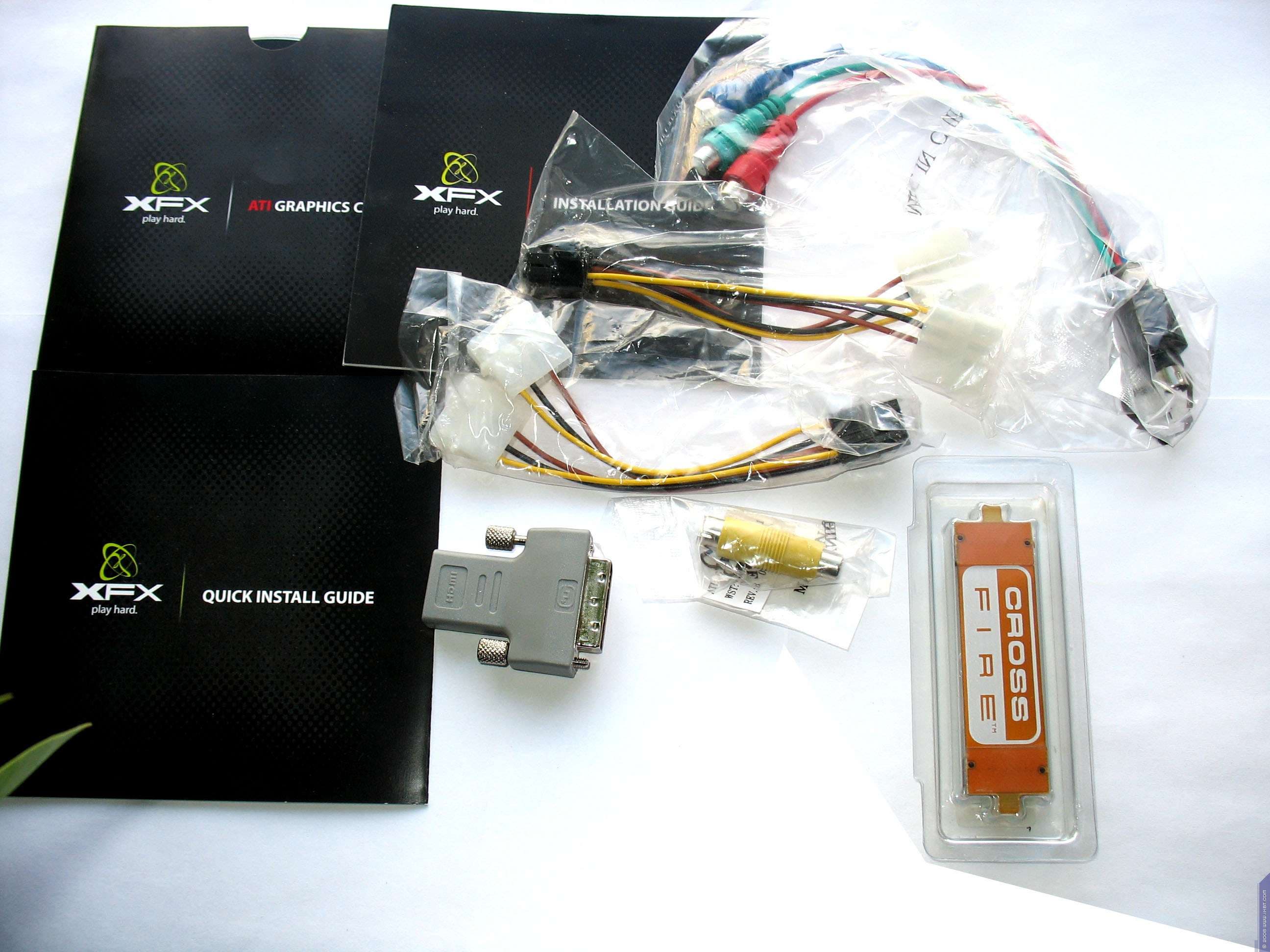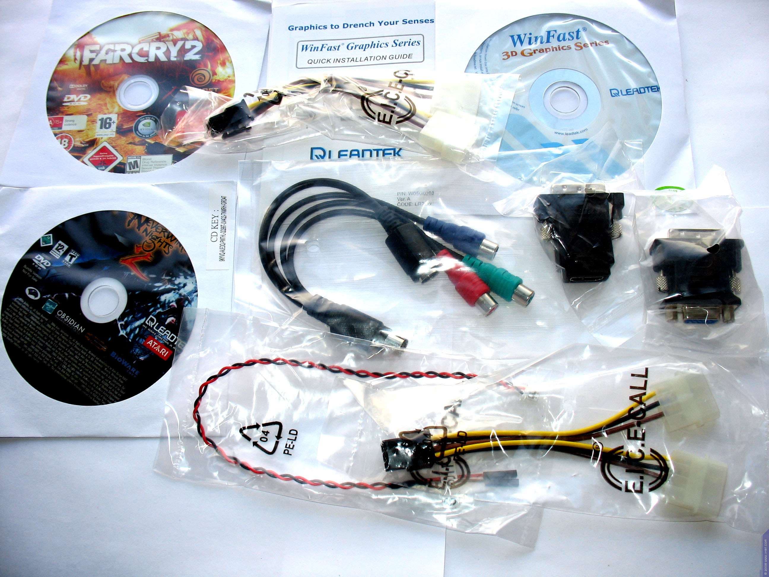 Базовый комплект поставки должен включать в себя: руководство пользователя, диск с драйверами и утилитами, переходник-адаптер DVI-to-VGA, DVI-to-HMDI адаптер, адаптер компонентного вывода (TV-out), аудио-шнурок для вывода на HDMI (для GTX карт), а также разветвители внешнего питания. Далее мы покажем, что предлагается к каждой карте дополнительно.