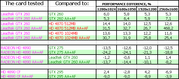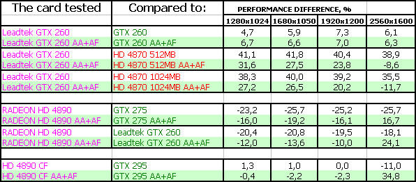 Leadtek WinFast GTX260 Extreme+ 896MB PCI-E — референс-продукт, имеющий незначительно повышенные частоты, которые принесли невысокие дивиденды (от 5 до 8 процентов прироста производительности). Есть некоторая странность в названии, которая может спутать читателя (он привык, что Extreme+ — это значит экстремально разоганный продукт, к которому приложили руки инженеры компании, а в данном случае заслуга Leadtek невелика, ведь увеличение числа процессоров с 192 до 216 — это заслуга Nvidia, а не Leadtek. А разогнать слегка ускоритель — это не проблема). Поэтому в целом это рядовой GTX 260, имеющий бонусы в виде повышенных частот и комплекта поставки с играми.