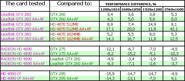 Вначале подведем итог под сравнением HD 4890 CrossFire и GTX 295. На момент написания материала соотношение цен было таким, что две карты 4890 имеют суммарную стоимость равную цене GTX 295. При этом нет четкого превосходства или поражения над соперником (есть и равенства, есть и победы, есть и отставания). Поэтому в целом пока есть ощущение, что GTX 295 является чуть более выгодным приобретением, просто потому, что это одиночная карта, способная работать в любой платформе, и не зависит от наличия второго слота PCI-E x16. Ну и наверно все же суммарное энергопотребление у GTX 295 будет поменьше, чем у двух 4890. При этом требуется всего два «хвоста» от БП для GTX 295 (один из них 8-пин), а не 4, что нужно двум 4890.