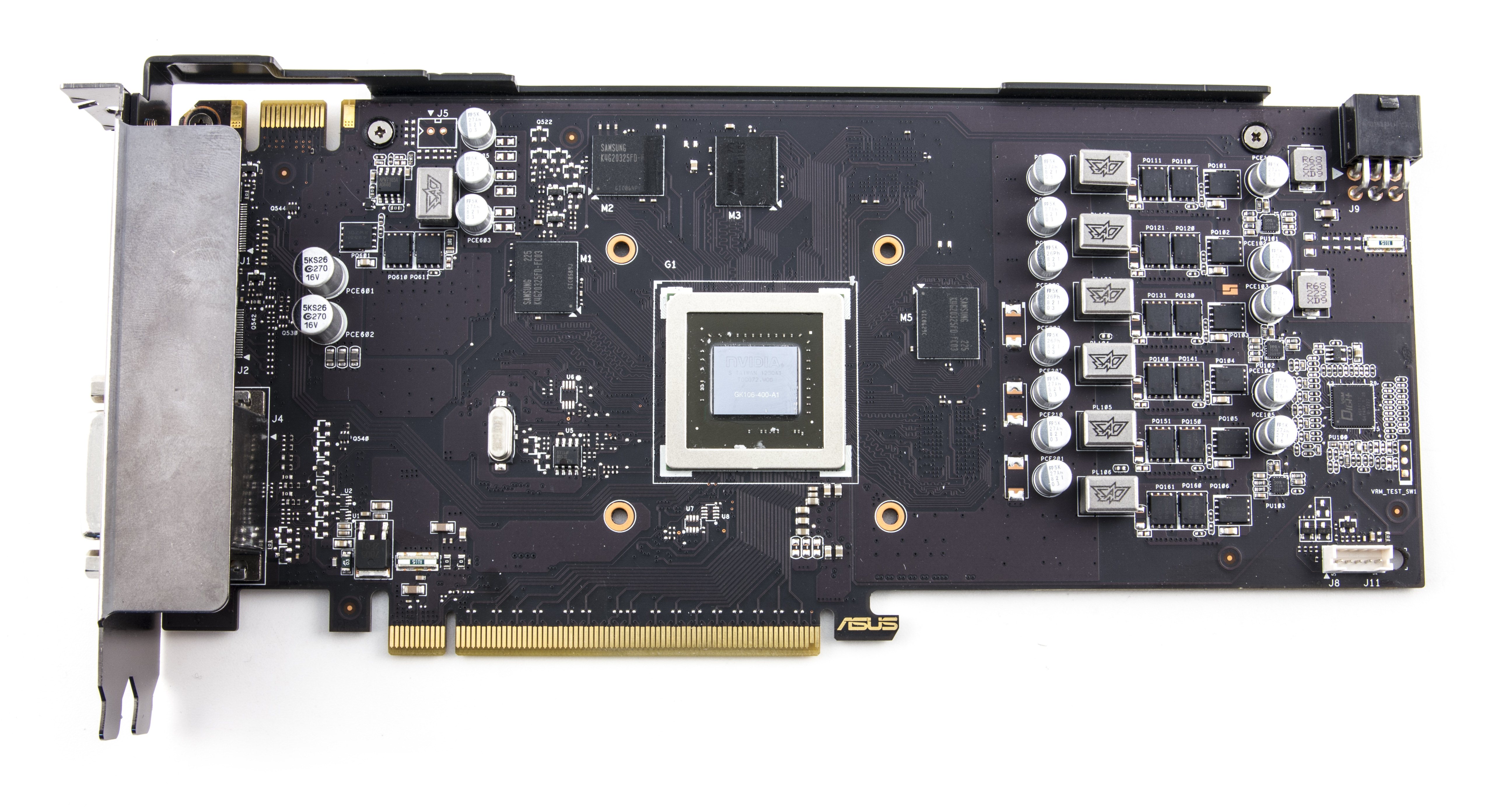 Как я уже отмечал, и не раз, эталонный образец дизайна GTX 670/660, предусматривающий маленькие размеры PCB, как-то не прижился у производителей. По сути только Zotac и выпускает карты такого же размера. Остальные все же используют полноразмерные дизайны, если можно так сказать. Вот и теперь мы видим, что от референс-дизайна осталось только расположение микросхем вокруг ядра. Остальное все переделано. Главное — усилен силовой блок. Схема питания ядра стала 6-фазной вместо 4-фазной у эталонного дизайна. Все это дает широкие возможности для оверклокинга, поскольку можно менять вольтажи с ювелирной точностью. Кстати, для этого Asus выпускает соответствующие утилиты, идущие в комплекте поставки, а также их можно скачать с веб-сайта компании. Набор гнезд стандартный для GTX 660Ti/670/680: 2 DVI (один из которых Single-Link и совместим с выводом на VGA) и по одному DisplayPort и HDMI (второе гнездо DVI обладает возможностью через адаптер передавать сигнал на HDMI, поэтому суммарно можно подключить 2 приемника с HDMI). Напомним, что ускорители Nvidia достаточно давно обладают собственными звуковыми кодеками, поэтому передача на HDMI-монитор будет полноценной, со звуком.