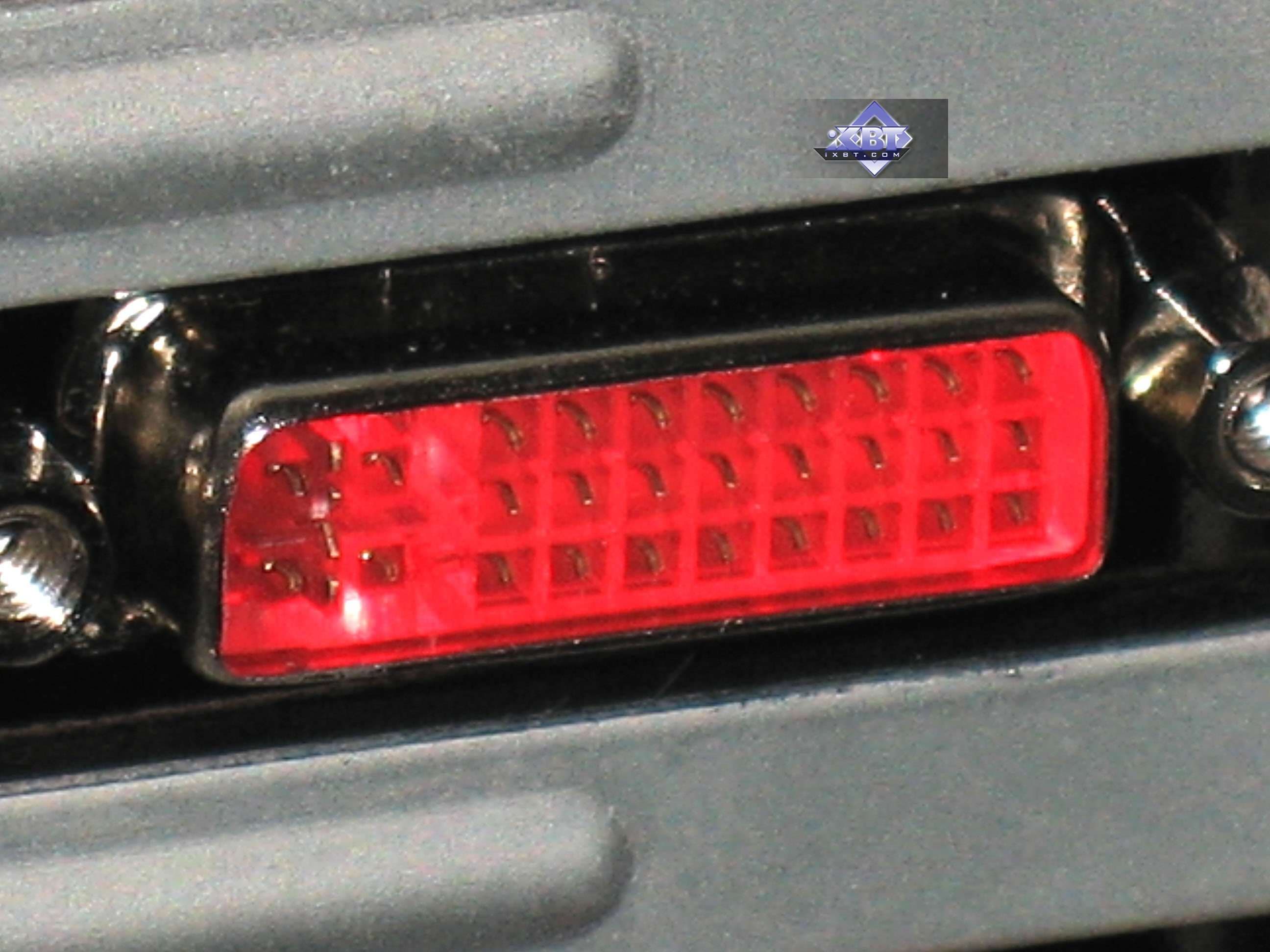 Давайте посмотрим на 3850 с 1 ГБ памяти и уникальной кнопкой на костыле (брэкете), которая не только повышает вольтаж на ядре, но и включает подсветку… в DVI-разъемах. Уж чего-чего, а подсветка в разъемах — это то, чего мы менее всего ожидали, потому Asus даже как-то ошеломил своей «изюминкой». Правда, после недолгих размышлений пришлось признать, что это нововведение мало кому интересно, ибо у всех системные блоки стоят разъемами к стене, и свечение DVI будет не видно. Да и, по сути, всего один разъем будет светиться, ибо второй будет закрыт разъемом от монитора.