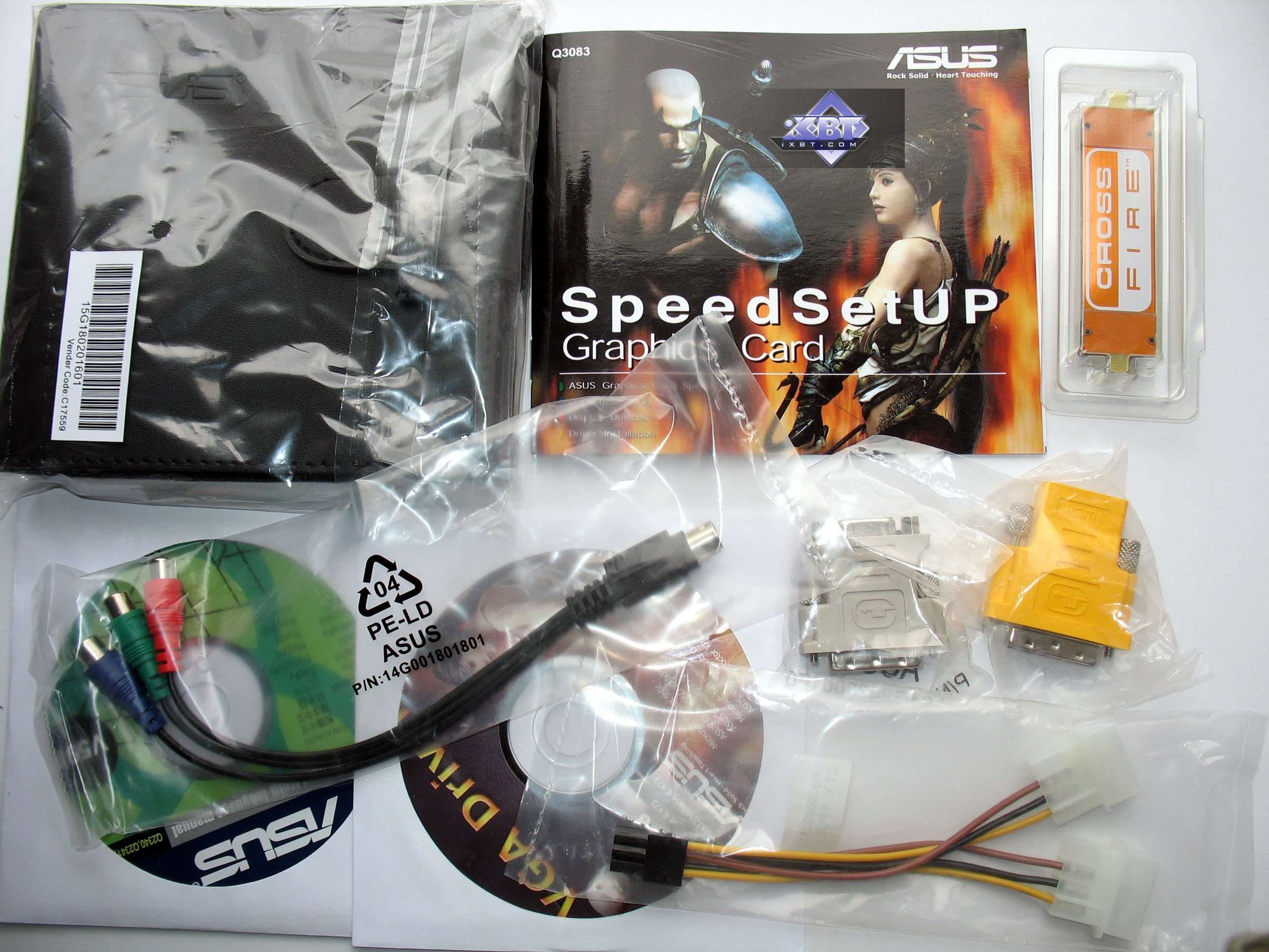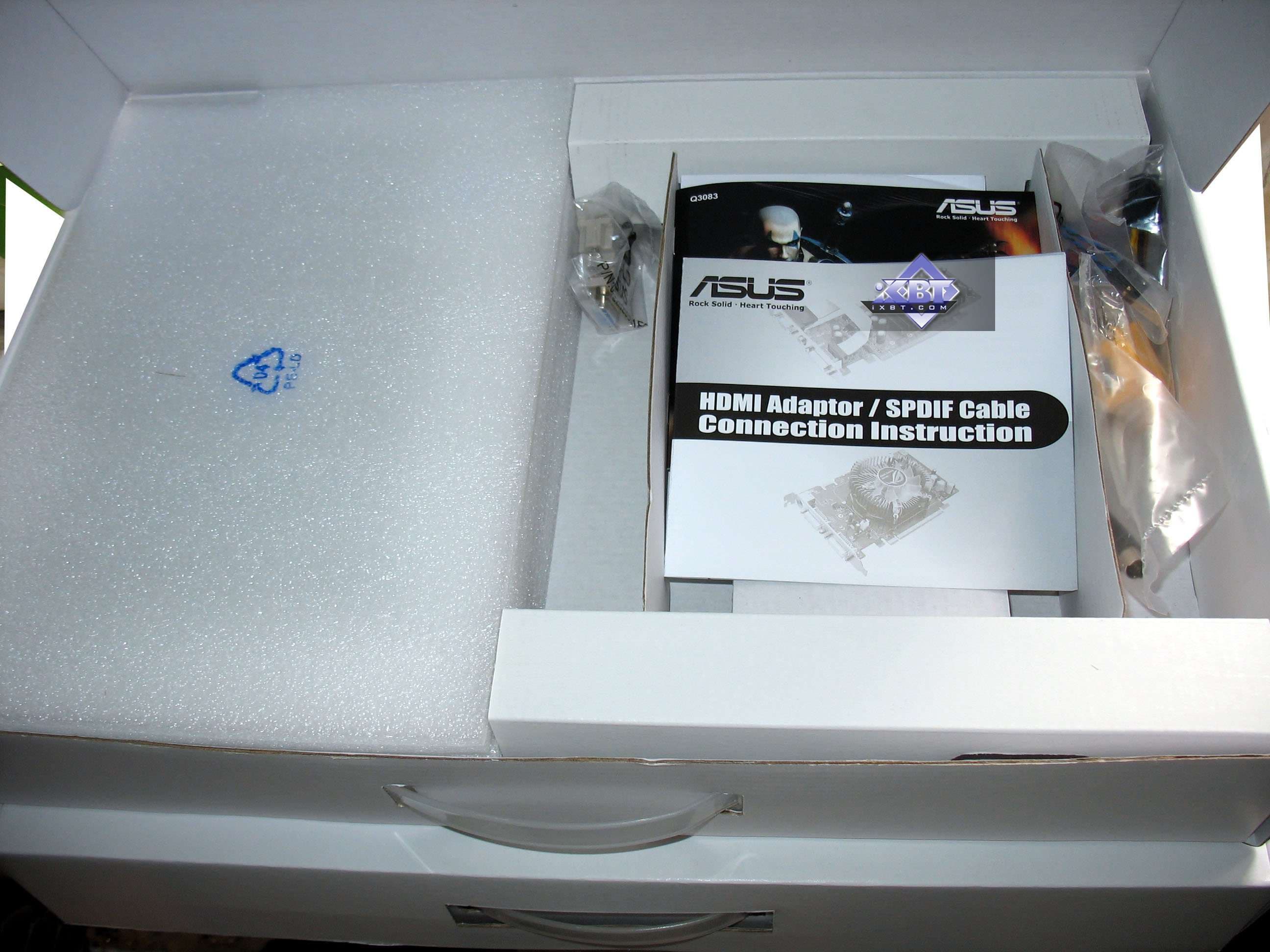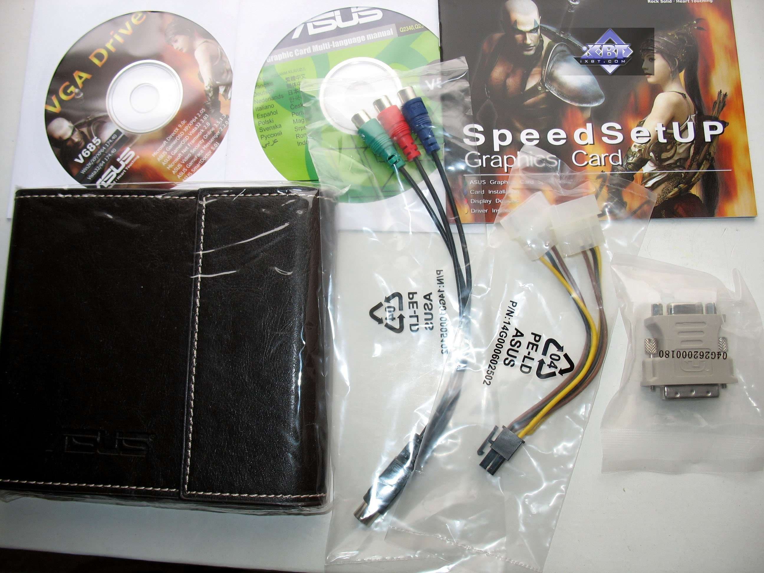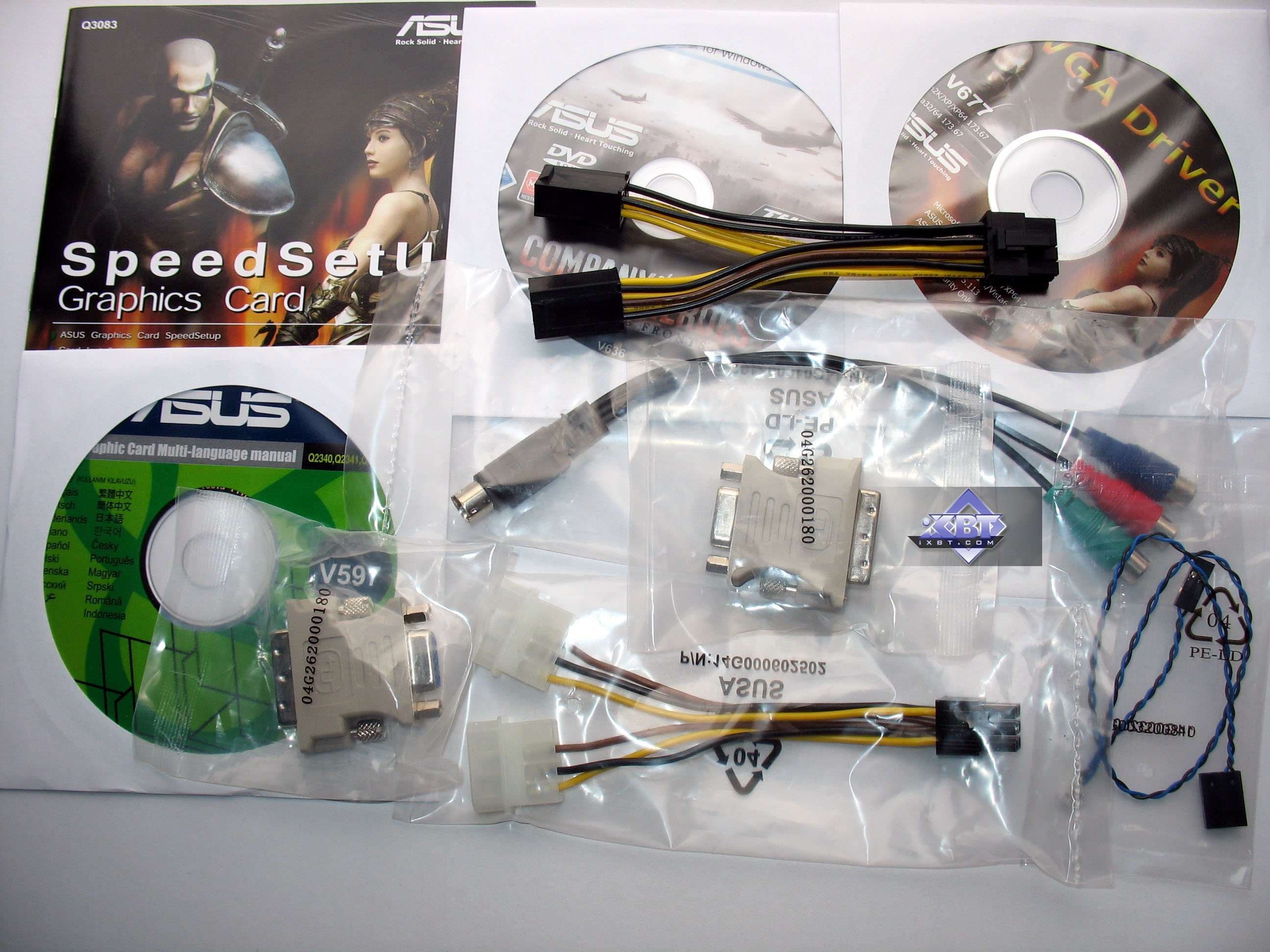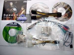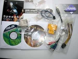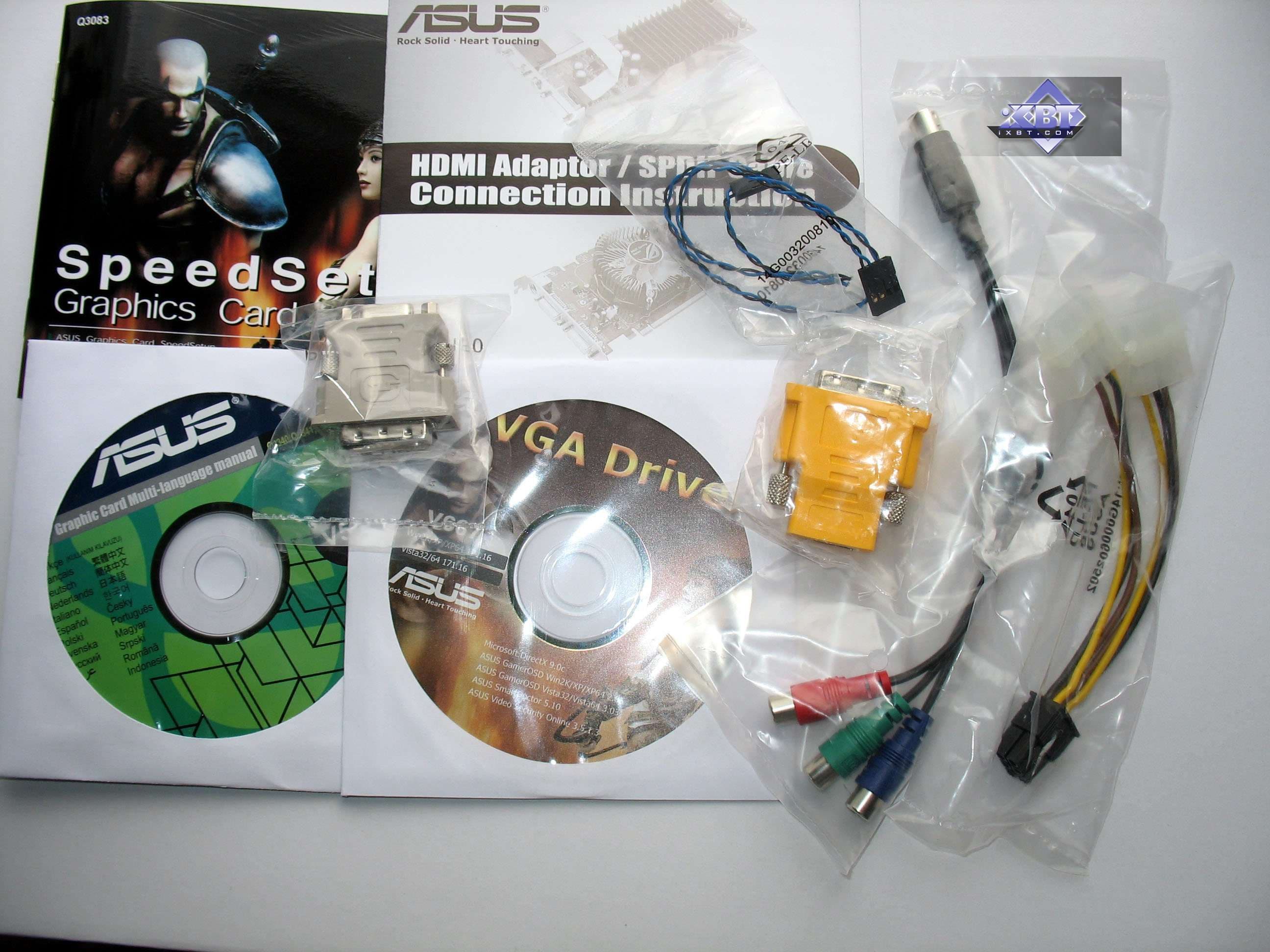 Базовый комплект поставки должен включать в себя: руководство пользователя, диск с драйверами и утилитами, переходник-адаптер DVI-to-VGA, DVI-to-HMDI адаптер, адаптер компонентного вывода (TV-out), а также разветвители внешнего питания и аудио-шнурок для соединения со звуковой картой (для передачи звука по HDMI) (только для Geforce-карт!). Далее мы покажем, что предлагается к каждой карте дополнительно.