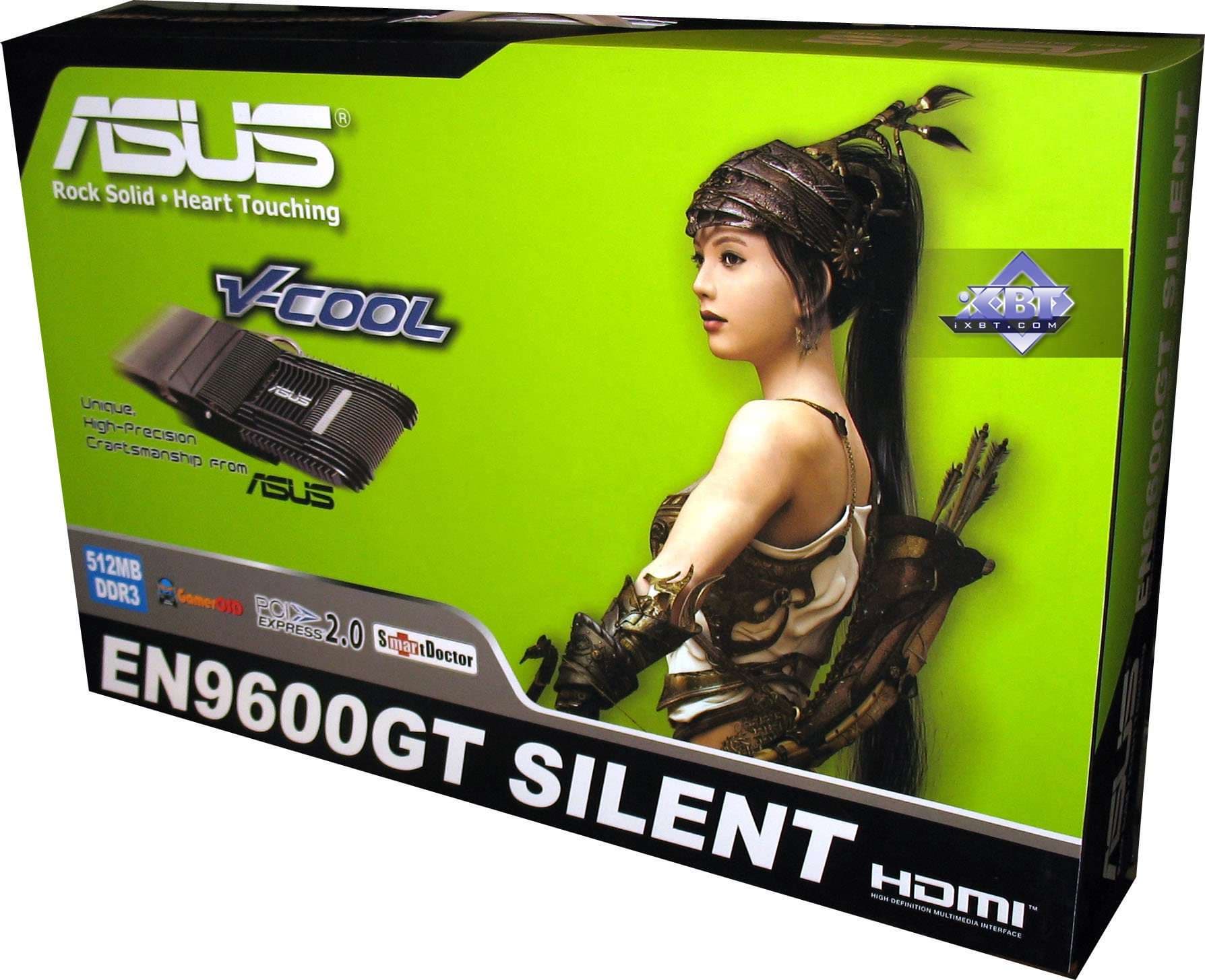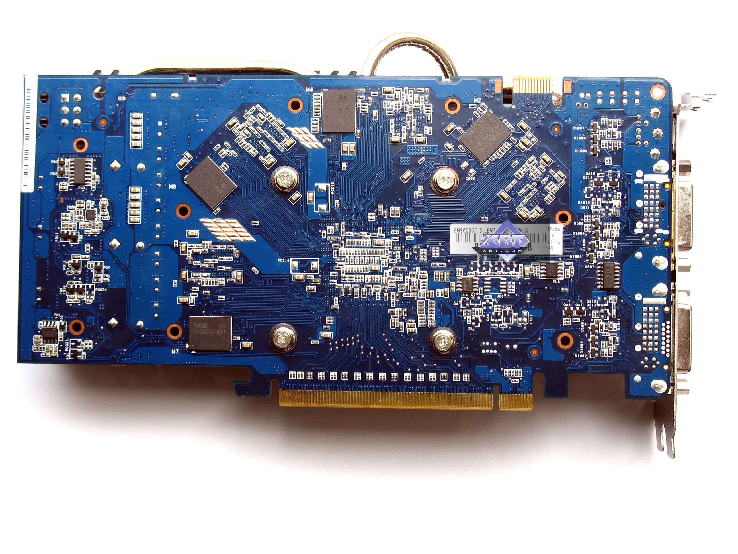 Geforce 9600 GT с бесшумным кулером — это тоже плод творческих изысков инженеров Asus, которые кроме одевания оригинальной СО (о ней далее в статье) изменили и саму PCB, пустив микросхемы памяти в пляс водить хороводы вокруг GPU с обеих сторон PCB.