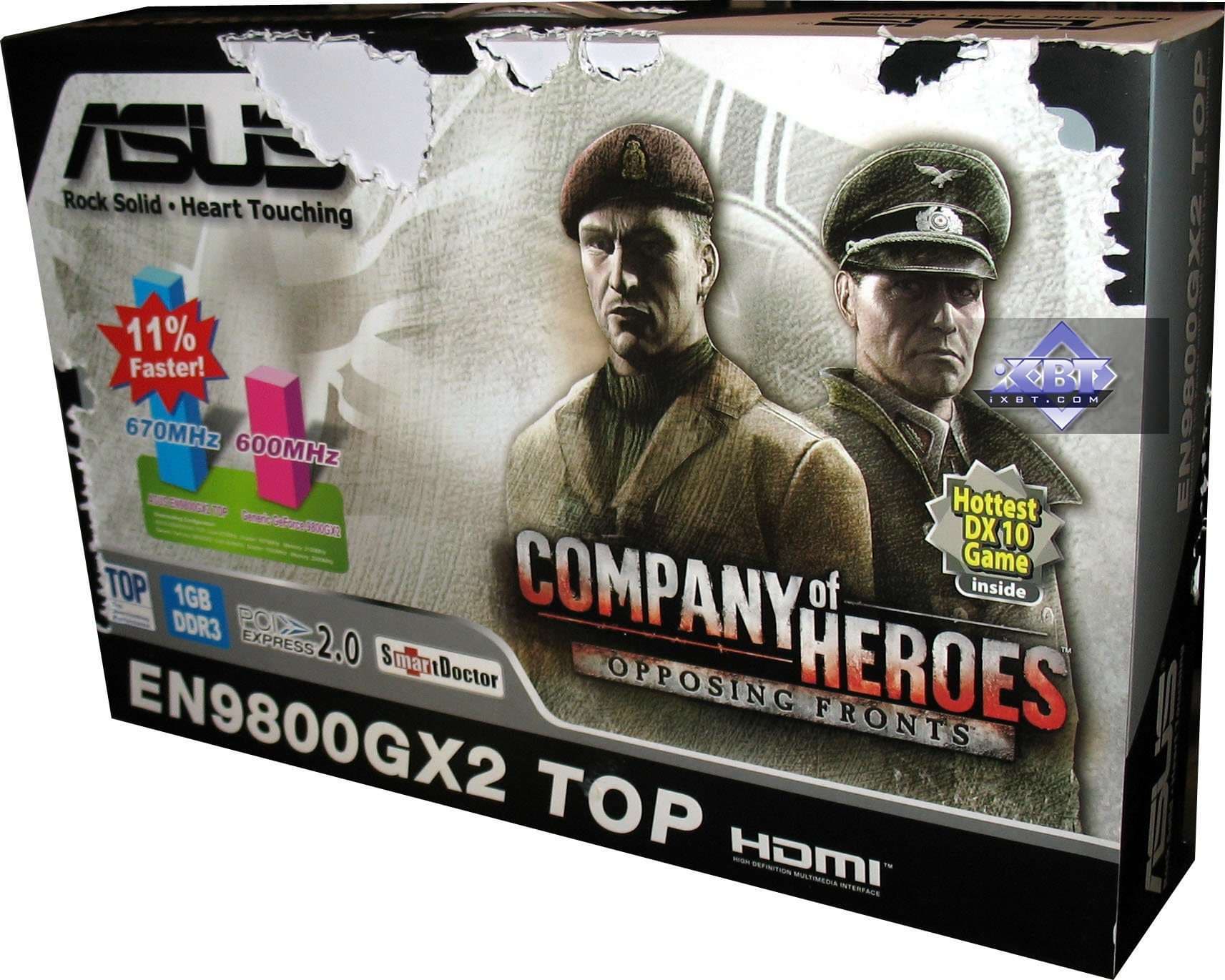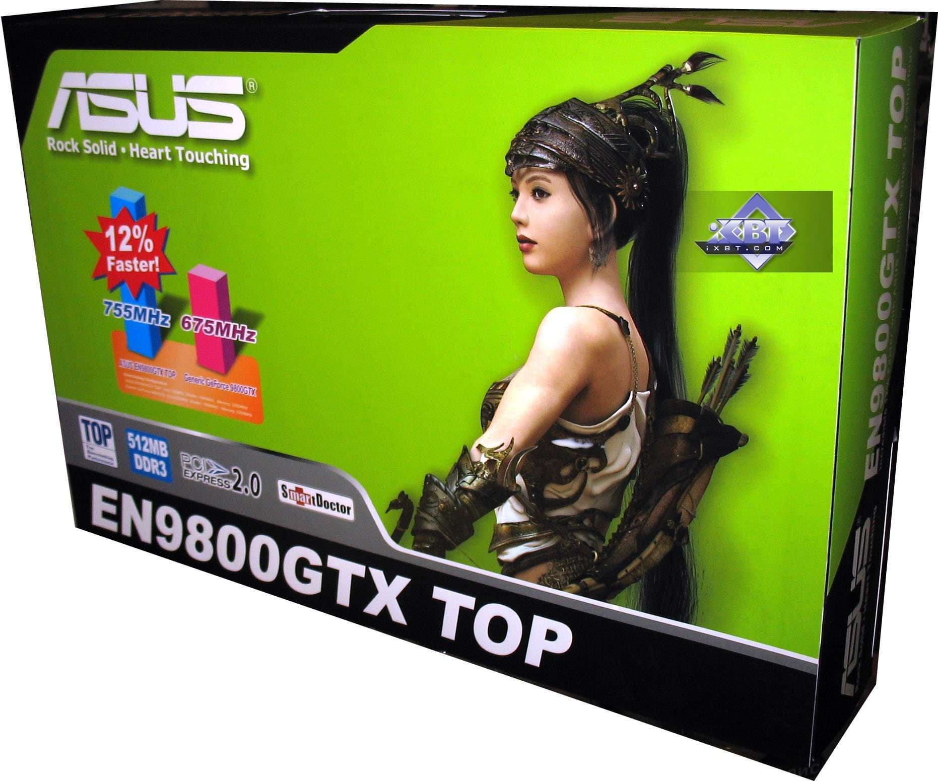 Asus Geforce 9800 GTX TOP (EN9800GTX) 512MB PCI-E — видеокарта, по сути, повторяющая по частотам результаты 9800 GTX+ (крайне незначительная разница в частоте ядра дает мизерную разность в скорости, укладываемую в погрешность вычислений), поэтому мы специально не вносили этот продукт в диаграммы, все можно увидеть в нашем 3DSpeed. Да, ускоритель явно быстрее, чем 4850, но и цена у него сильно выше, и отнюдь не $199, к какой уже на всех парах стремится RADEON 4850. В целом карта — референс, никаких особенностей от Asus нет.