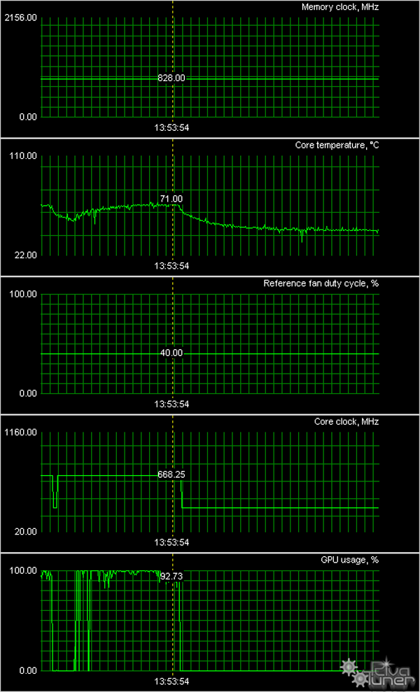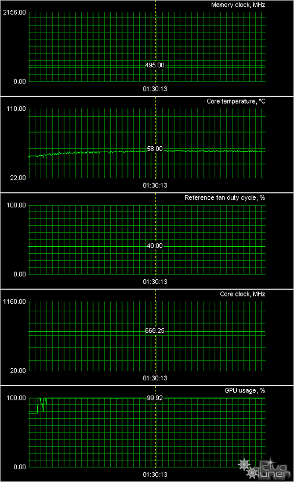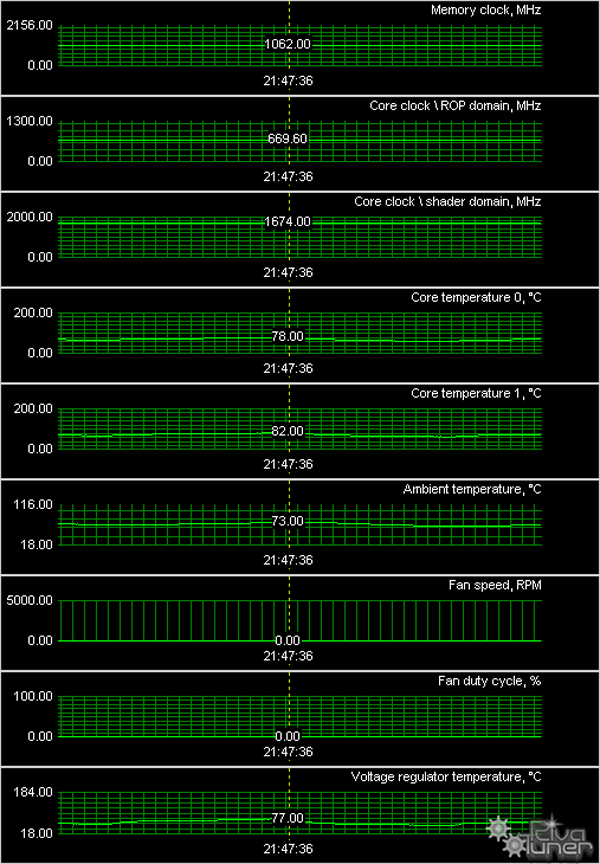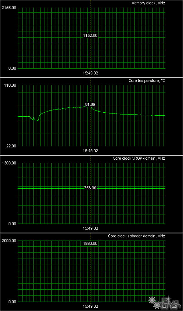 Мы провели исследование температурного режима с помощью утилиты RivaTuner (автор А. Николайчук AKA Unwinder) и получили следующие результаты: