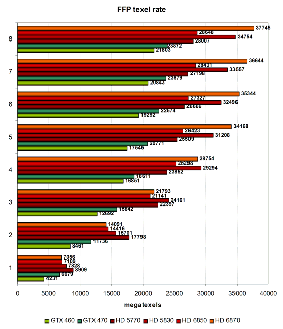 Повторимся в очередной раз, что в данном тесте фильтрации RGB8-текстур большинство видеокарт показывают цифры, далёкие от теоретически возможных. И далее, в тесте из пакета 3DMark Vantage, есть более жизненные цифры. Результаты нашей текстурной синтетики в случае видеоплат HD 6800 сильно не дотягивают до пиковых значений, по ней получается, что новый чип выбирает лишь до 42 текселей за один такт из 32-битных текстур при билинейной фильтрации в этом тесте, что на треть меньше теоретической цифры в 56 отфильтрованных текселя.