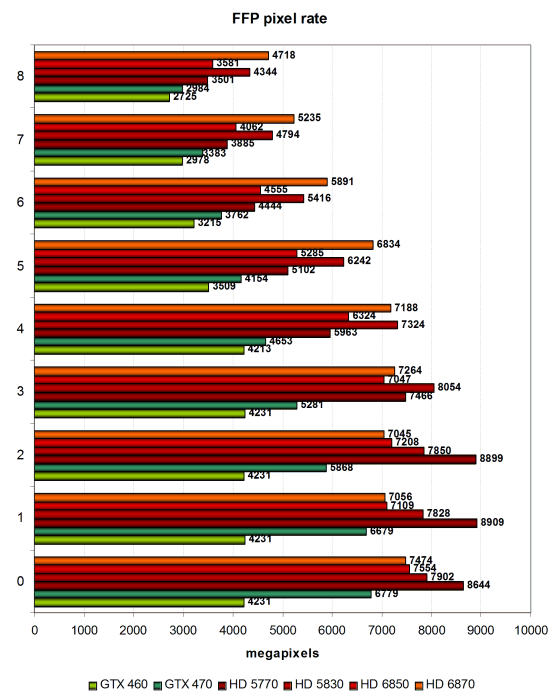 Забавно и то, что мы уже отметили подобный подход в обзоре Geforce GTX 580 — видимо, и в AMD несколько изменили баланс в новых GPU и/или драйверах и лёгкие условия принесли в жертву более тяжёлым. Рассмотрим эти же результаты в тесте филлрейта: