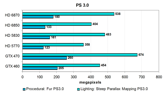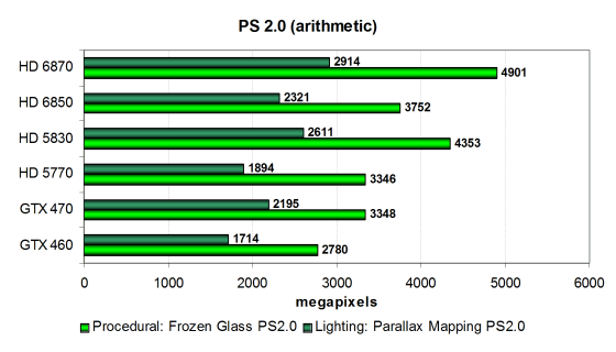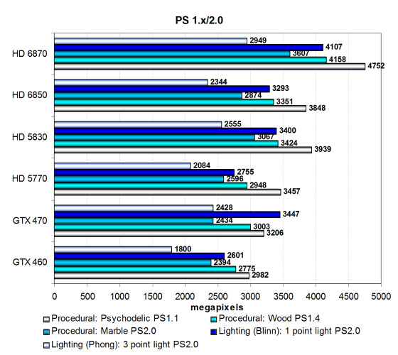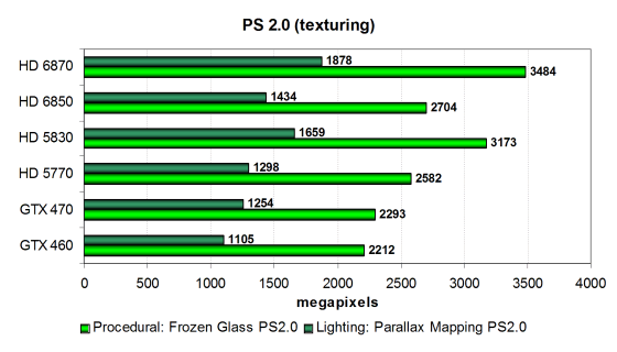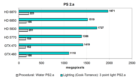 Производительность в этих тестах ограничена по большей части филлрейтом и скоростью текстурных модулей, но с учётом эффективности блоков и кэширования текстурных данных. Новые модели Radeon попарно чуть быстрее предшествующих: HD 6870 быстрее HD 5830, а HD 6850 быстрее HD 5770. Ну и все они опережают две модели Geforce — GTX 470 в этих тестах показывает результат лишь на уровне HD 5770, да и у GTX 460 явно виден недостаток скорости текстурирования.