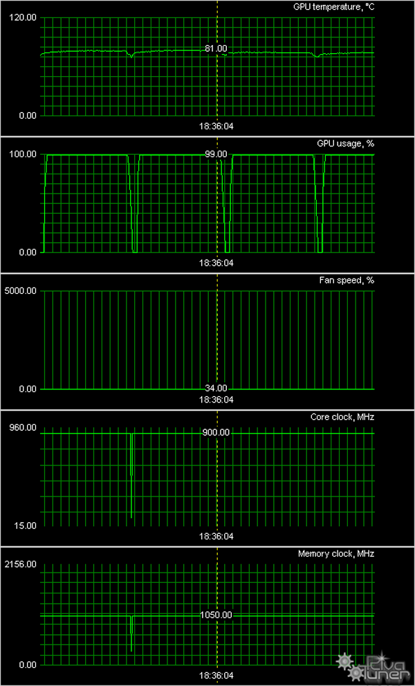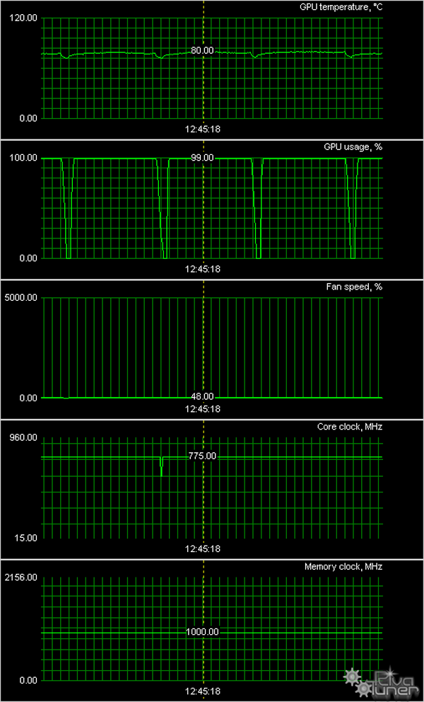 Мы провели исследование температурного режима с помощью утилиты EVGA Precision (автор А. Николайчук AKA Unwinder) и получили следующие результаты: