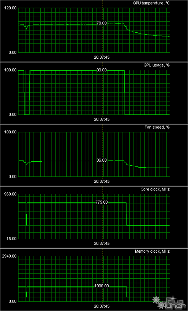Мы провели исследование температурного режима с помощью утилиты EVGA (автор А. Николайчук AKA Unwinder) и получили следующие результаты: