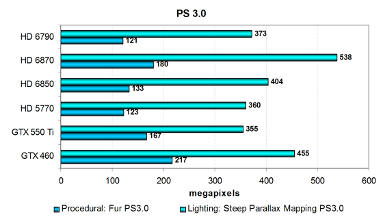 В самых простых шейдерах разница между GTX 550 Ti и HD 6790 составила 30-50% в пользу новой модели от компании AMD. Мы видим, что в сравнительно лёгких тестах важнее всего скорость текстурирования, и по этому параметру видеокарты Nvidia проигрывают своим конкурентам. Посмотрим на результаты более сложных пиксельных программ промежуточных версий: