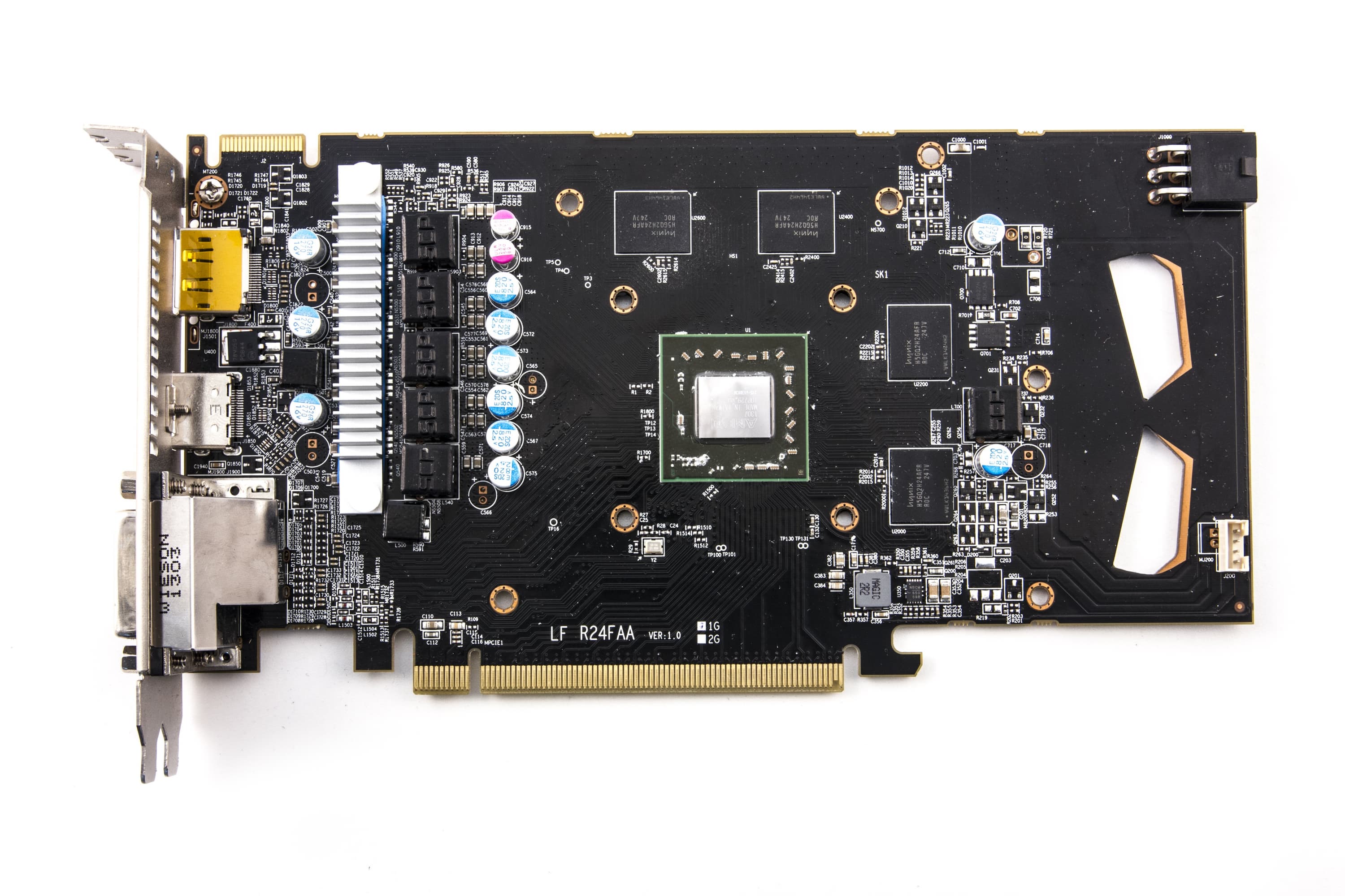 Мы видим, что карта довольно проста, да этого и следовало ожидать, поскольку на PCB разведена 128-битная шина обмена с памятью, которая нам знакома уже очень много лет. Микросхем памяти всего 4, поэтому тут тоже ничего особенного. Дизайн PCB — свой собственный, разработан Powercolor, мы сравниваем его с 7770, потому что эталонного дизайна для 7790 как такового нет, чипы 7770 и 7790 одинаковы по разводке, поэтому PCB от 7770 вполне подойдет и для 7790. Система питания является пятифазной.