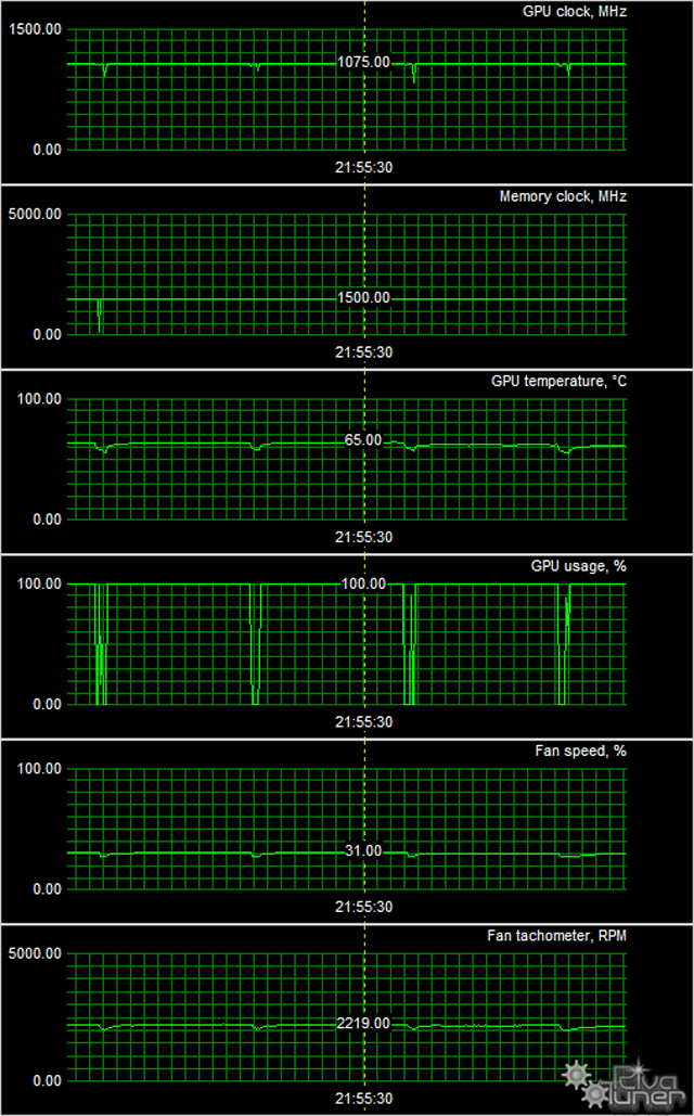 Мы провели исследование температурного режима с помощью утилиты EVGA PrecisionX (автор А. Николайчук AKA Unwinder) и получили следующие результаты: