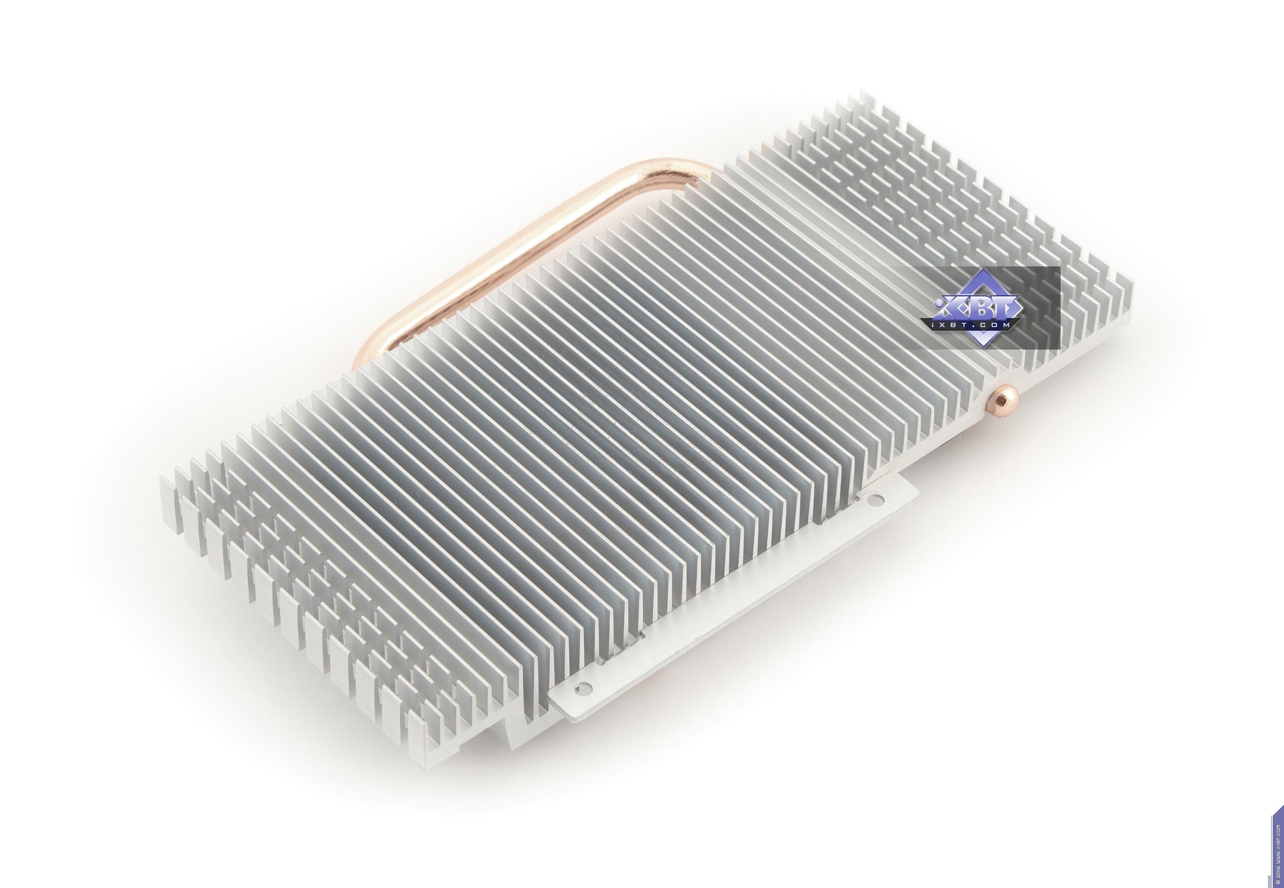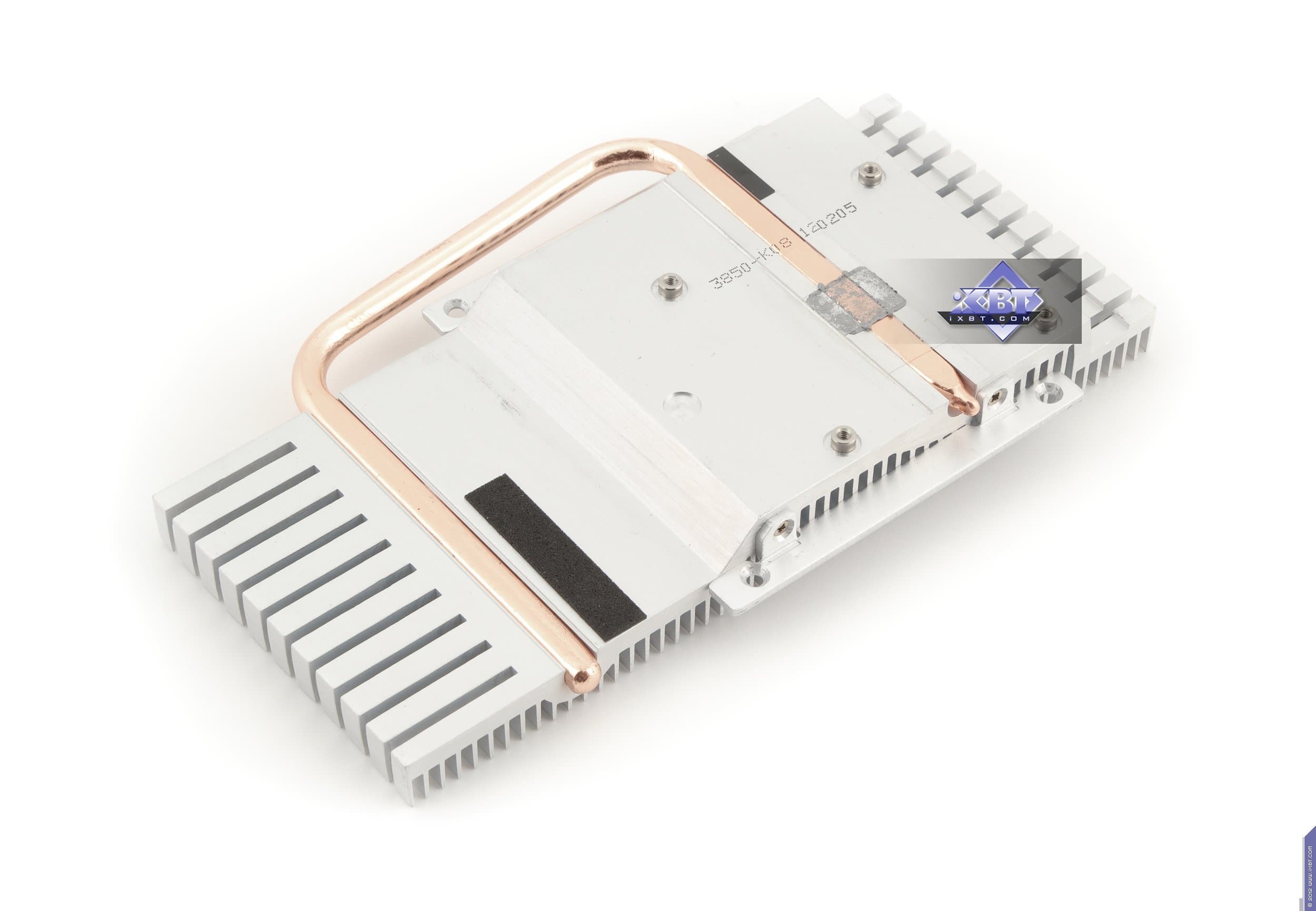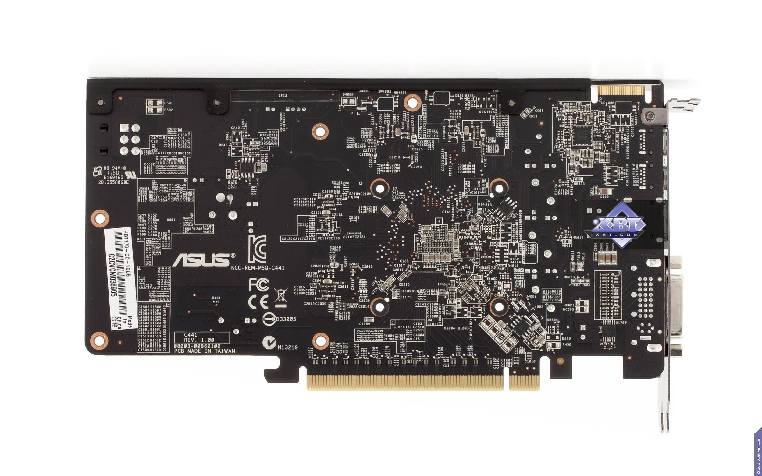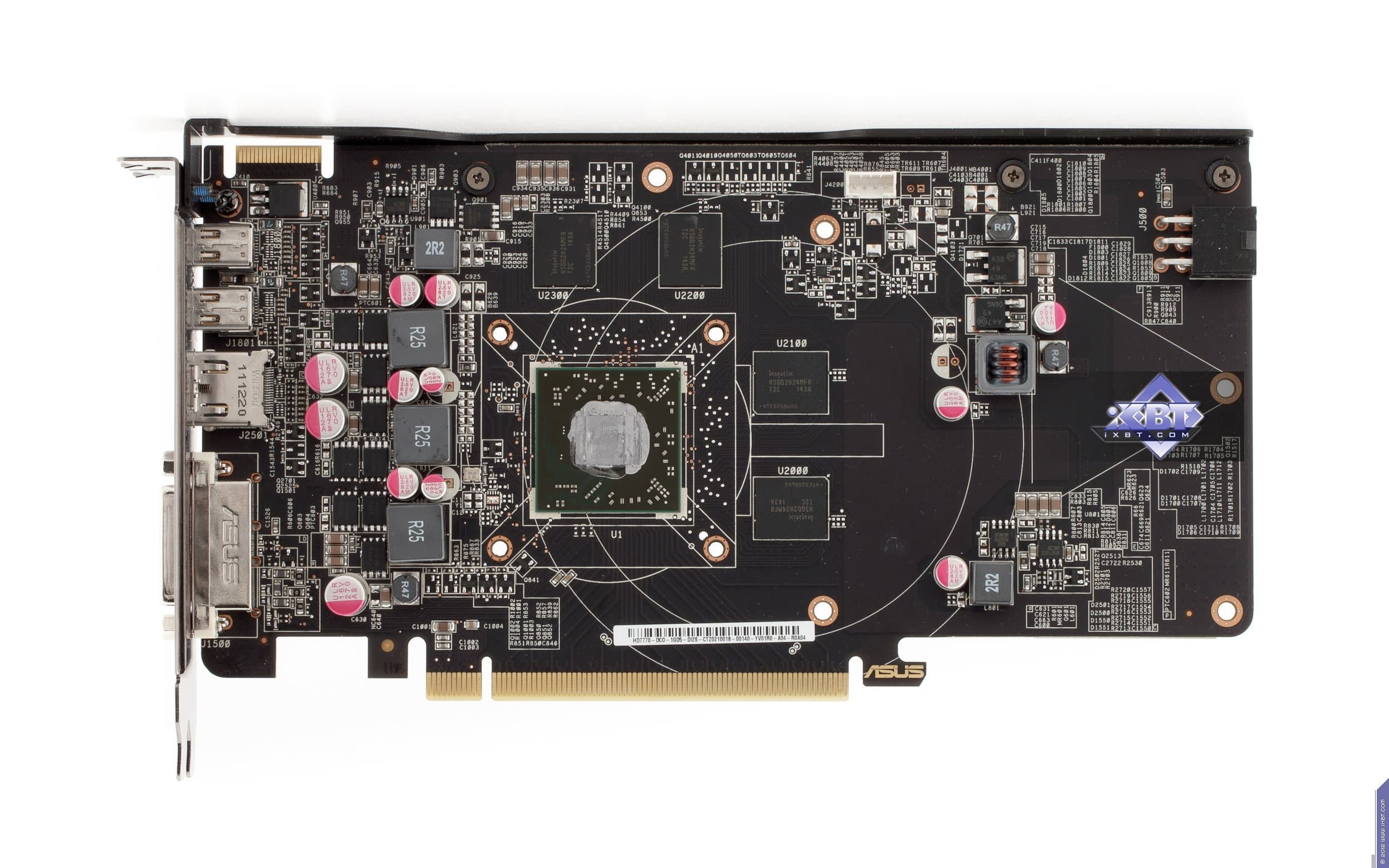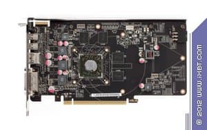 Если посмотрим на печатную плату Asus Radeon HD7770 DirectCU TOP 1024 МБ 128-битной GDDR5 PCI-E, то увидим по сути копию референс-карты. Разумеется, PCB произведена на фабрике самой компании, да и по фирменному стилю с закругленными углами можно понять, что PCB своего выпуска, просто копирует эталонный дизайн. Зачем же столько пустого места на карте? Ответ прост: чтобы хорошо закрепить систему охлаждения на карте (имеется в виду референс). СО компании Asus также немаленькая, поэтому они решили не изобретать «велосипед». Схема карты проста: четыре микросхемы памяти, образующие шину 128 бит и одновременно 1 гигабайт. Трехфазная система питания для ядра и однофазная для памяти. Ускоритель требует внешнего питания в виде одного 6-пинового разъема, так что, надеемся, у всех потенциальных покупателей уже есть БП с такими «хвостами». Гнезды вывода: один DVI (Dual-link, возможен вывод на HDMI и d-Sub через соответствующие адаптеры), HDMI 1.2 и два разъема Display Port 1.4 в мини-формате (требуются переходники на полноценный формат).