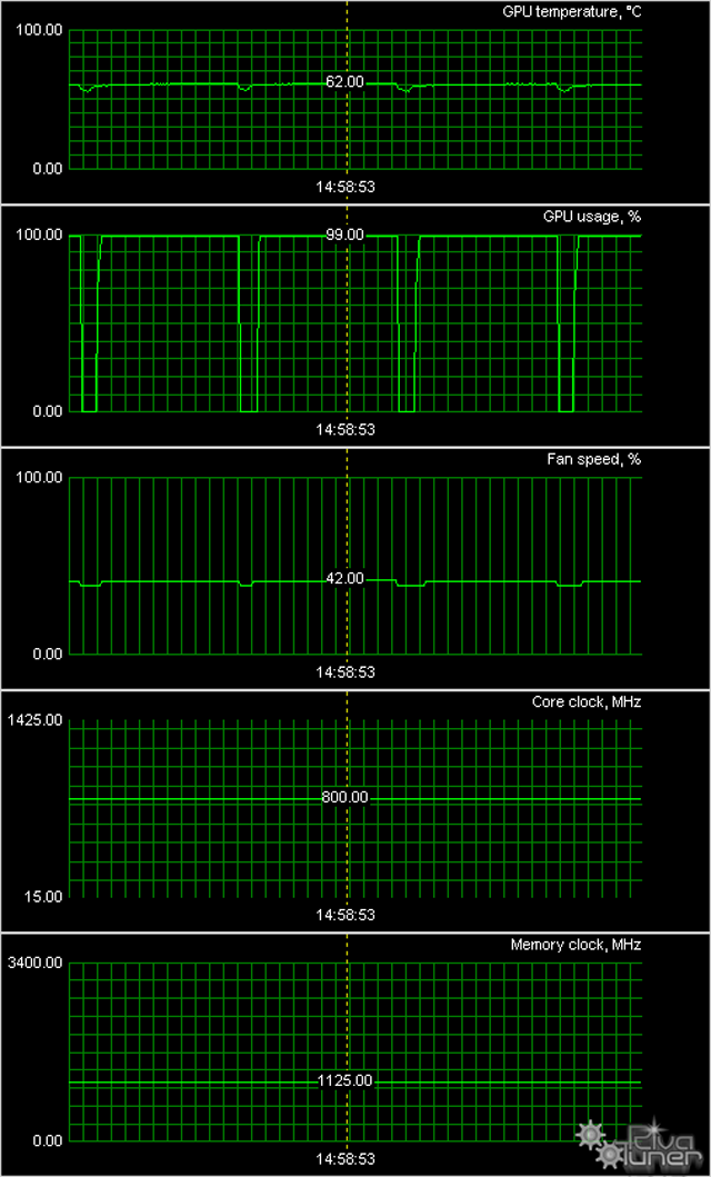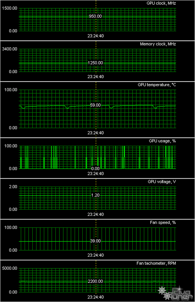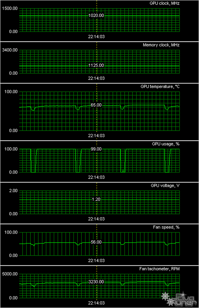 Мы провели исследование температурного режима с помощью утилиты MSI Afterburner (автор А. Николайчук AKA Unwinder) и получили следующие результаты: