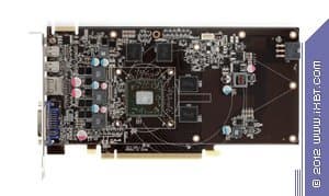 И в заключение посмотрим на XFX Radeon HD7750 Black Edition 1024 МБ 128-битной GDDR5 PCI-E. Очевидно, что в данном случае мы имеем дело вообще с уникальным дизайном. Во-первых, карта внешне похожа на 7770, имеет гнездо внешнего питания и разъем для моста CrossFire, во-вторых, дизайн все равно свой, ибо силовой блок перенесен в хвостовую часть. Инженеры дают понять, что если требуется карту сильно разгонять, то уже могут быть проблемы с нехваткой питания через слот PCI-E. Поэтому взяли за основу дизайн с блоком питания, берущим дополнительную подпитку через 6-пиновый разъем. С гнездами вывода также новшество: добавлен один DVI-разъем, однако уже Single-Link, и возможность вывода на d-Sub переведена именно на него.