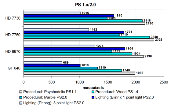 Новая видеоплата AMD в этом сравнении показывает очень неплохой результат, если сравнивать с конкурирующей Geforce GT 640, во всех тестах опережая решение Nvidia. Отставание от HD 7750 обусловлено теоретической разницей в количестве активных исполнительных блоков, а вот выигрыш старой HD 6670 в некоторых из подтестов весьма любопытен и объясняется разницей в пиковой математической производительности, которая у «старичка» выше. Особенно хорошо это заметно по результатам теста освещения по Фонгу, в котором важна именно скорость обработки математики. Посмотрим на более сложные пиксельные программы промежуточных версий: