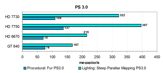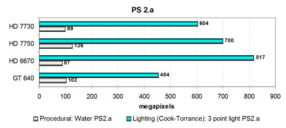 Цифры из этого подтеста 3DMark Vantage показывают производительность блоков ROP с учётом величины пропускной способности видеопамяти (т. н. «эффективный филлрейт»), и тест иногда измеряет скорее пропускную способность памяти, а не производительность ROP. По второму показателю Radeon HD 7730 просто нечем похвастать, ведь количество блоков ROP у неё урезано вдвое, по сравнению с HD 7750.