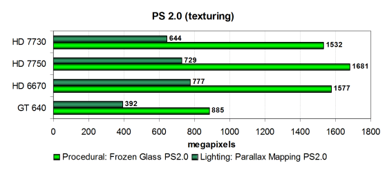 Второй подтест с более сложными попиксельными расчётами куда интереснее — в нём HD 7730 всё так же отстаёт от старшей модели, но уже опережает предшественницу, а значит, что скорость ограничена в основном эффективностью математики. Рассматриваемая Radeon HD 7730 снова обходит конкурента Nvidia, но GT 640 отстаёт от неё в этот раз не так уж и сильно.