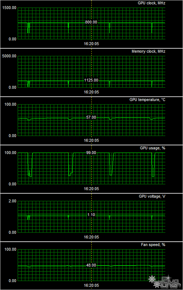 Мы провели исследование температурного режима с помощью новой версии утилиты EVGA PrecisionX (автор А. Николайчук AKA Unwinder) и получили следующие результаты.