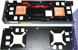 Сам же новый кулер использует две испарительные камеры (по одной на каждый GPU) и единственный вентилятор, расположенный между ними по центру платы. Он вполне справляется с приёмом и отведением до 450 Вт тепла, и хотя новая плата размером точно такая же, что и Radeon HD 5970, все вышеперечисленные улучшения привели к тому, что новый кулер обладает заметно лучшей эффективностью, по сравнению с системой охлаждения предыдущего решения.