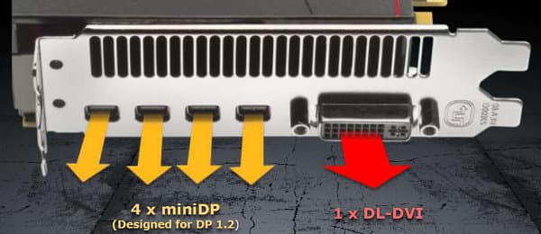 Из-за необходимости эффективного охлаждения, а в частности — максимального отвода нагретого воздуха, пришлось поменять и набор выводов видеосигнала. Ровно половину площади заглушки слота заняли отверстия выхлопа системы охлаждения. А на оставшейся части разместили один разъём Dual Link DVI и четыре разъёма mini DisplayPort 1.2. Таким образом, при всех ограничениях мощного кулера, удалось сохранить максимально возможное количество выводов.