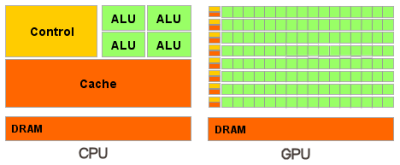 Вкратце можно сказать, что в отличие от современных универсальных CPU, видеочипы предназначены для параллельных вычислений с большим количеством арифметических операций. И значительно большее число транзисторов GPU работает по прямому назначению — обработке массивов данных, а не управляет исполнением (flow control) немногочисленных последовательных вычислительных потоков. Это схема того, сколько места в CPU и GPU занимает разнообразная логика: