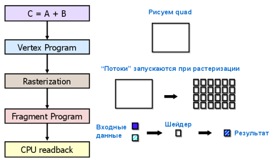 Чтобы перенести вычисления на GPU в рамках такой модели, нужен специальный подход. Даже поэлементное сложение двух векторов потребует отрисовки фигуры на экране или во внеэкранный буфер. Фигура растеризуется, цвет каждого пикселя вычисляется по заданной программе (пиксельному шейдеру). Программа считывает входные данные из текстур для каждого пикселя, складывает их и записывает в выходной буфер. И все эти многочисленные операции нужны для того, что в обычном языке программирования записывается одним оператором!