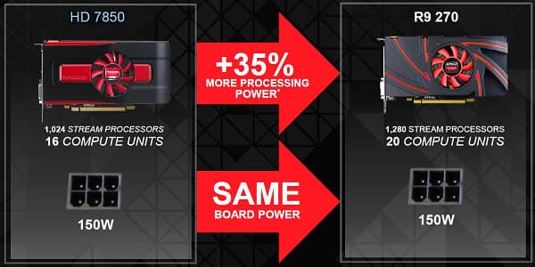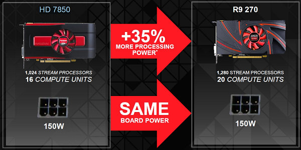 К примеру, можно сравнить новинку с Radeon HD 7850 из предыдущего поколения, последователем дела которой и является модель R9 270. При том же уровне потребления энергии в 150 Вт новая модель имеет на 35% больше математической мощи, так как графический процессор в данной модели содержит 1280 потоковых процессоров в отличие от 1024 ALU у HD 7850.