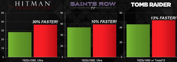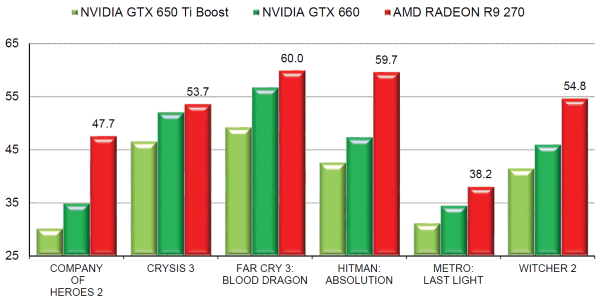 Как видите еще по трем играм, благосклонно относящимся к решениям AMD, в разрешении 1920×1080 и при максимальных настройках новая модель Radeon R9 270 показывает результат на 10-30% быстрее, нежели Geforce GTX 660 (которая, впрочем, на западном рынке все же стоит несколько дешевле). Интересно, что разница в игре Tomb Raider даже с внедренной компанией AMD технологией TressFX не такая уж радикальная — инженеры Nvidia явно преуспели в оптимизациях для этой игры в последних версиях драйверов.