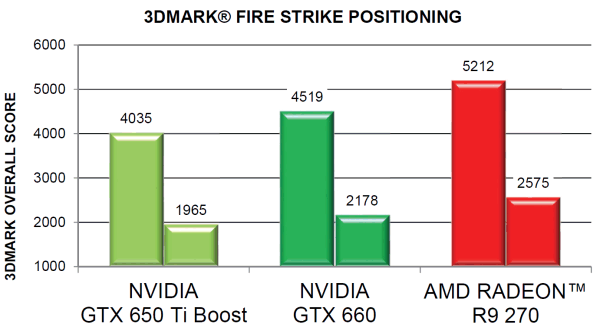 Посмотрим, как сама AMD позиционирует новое решение на рынке с использованием традиционного инструмента Fire Strike в двух разных конфигурациях (Performance и Extreme) из последней версии бенчмарка Futuremark 3DMark. Этот бенчмарк отлично подходит для современных видеокарт компании AMD, и количество очков, набранное в нем видеокартой Radeon R9 270, явно превосходит производительность двух моделей Geforce, которые были выбраны на роль конкурентов новинки.