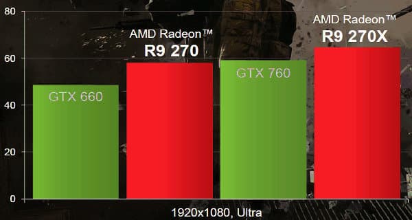 Итак, в этой игре новая модель Radeon R9 270 с хорошим запасом опережает чуть менее дорогую конкурирующую плату Nvidia Geforce GTX 660 в Ultra-режиме качества и Full HD-разрешении. Более того, она почти не уступает и куда более дорогой Geforce GTX 760. Которая, в свою очередь, проигрывает Radeon R9 270X. Ну а разница между двумя разными Radeon, основанными на одном и том же GPU, в этой игре и условиях получилась около 10%. Впрочем, по одной игре делать выводы все равно слишком смело, поэтому посмотрим результаты еще нескольких игр, входящих в специальную программу поддержки разработчиков компании AMD: