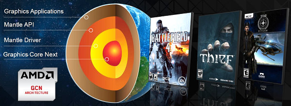 В Mantle API используют более «тонкую» программную оболочку между игровым движком и аппаратными ресурсами GPU подобно тому, как это давно делается на игровых консолях. AMD очень помогло и то, что все новые консоли основаны на чипах их производства, с графическими ядрами архитектуры GCN. Mantle был разработан в AMD при значительном участии ведущих игровых разработчиков из компании DICE, и игра Battlefield 4 является первым проектом, который будет использовать Mantle. Появление поддержки этого API в игре ожидается в конце декабря, когда выйдет бесплатное обновление, оптимизированное для видеокарт AMD Radeon.