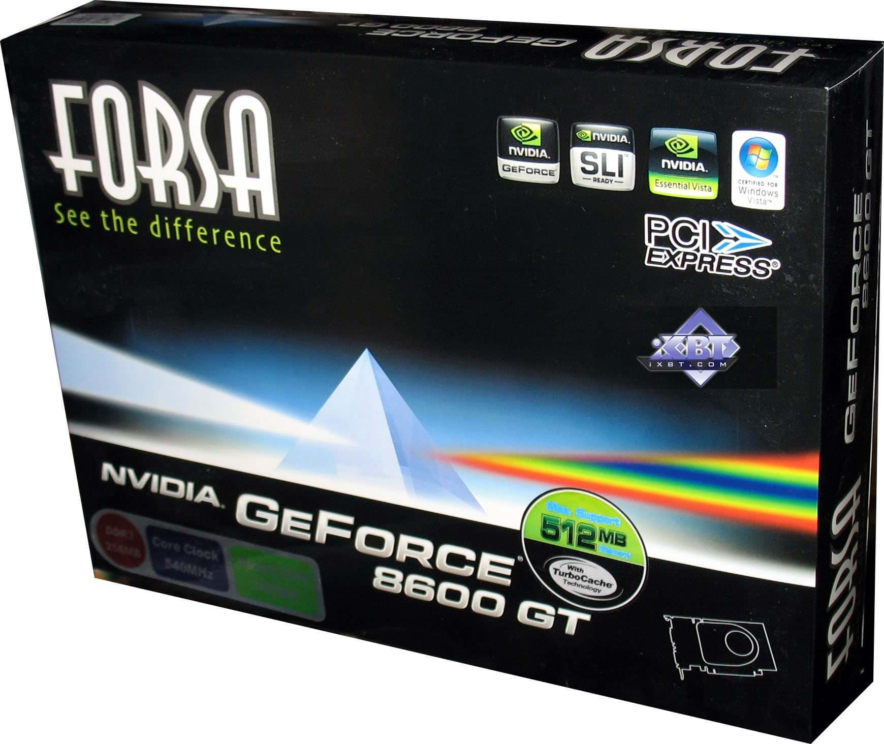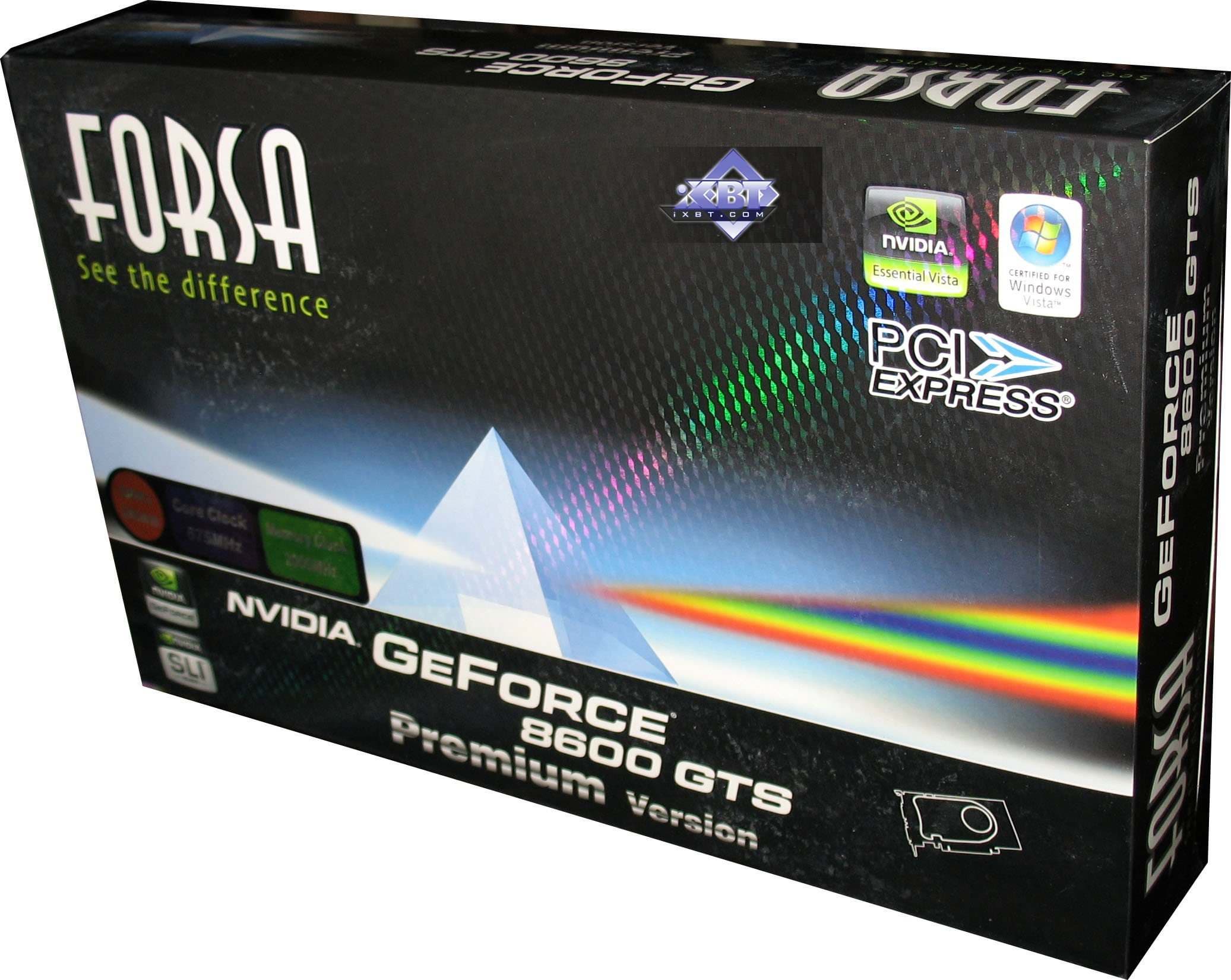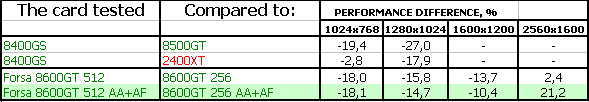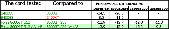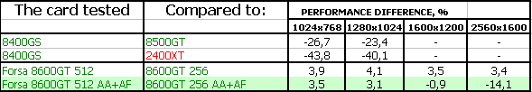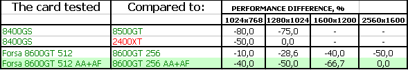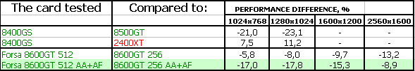 FORSA Geforce 8600 GTS 256MB PCI-E — карта полностью повторяет плюсы и минусы референс-продукта, обладает уже приличной производительностью, позволяющей в ряде игр выставлять качество уже почти на максимум, однако в мощных игровых приложениях последнего поколения и этот продукт будет неиграбелен, если не пожертвовать качеством в 3D. То бишь, использованием тех или иных эффектов. Минус — кулер шумноват. Надо использовать RivaTuner для снижения оборотов вентилятора, но при этом следить за температурой на ядре, чтобы она не превысила 80 градусов. Тесты все можно посмотреть в нашем материале по эталонному 8600 GTS.