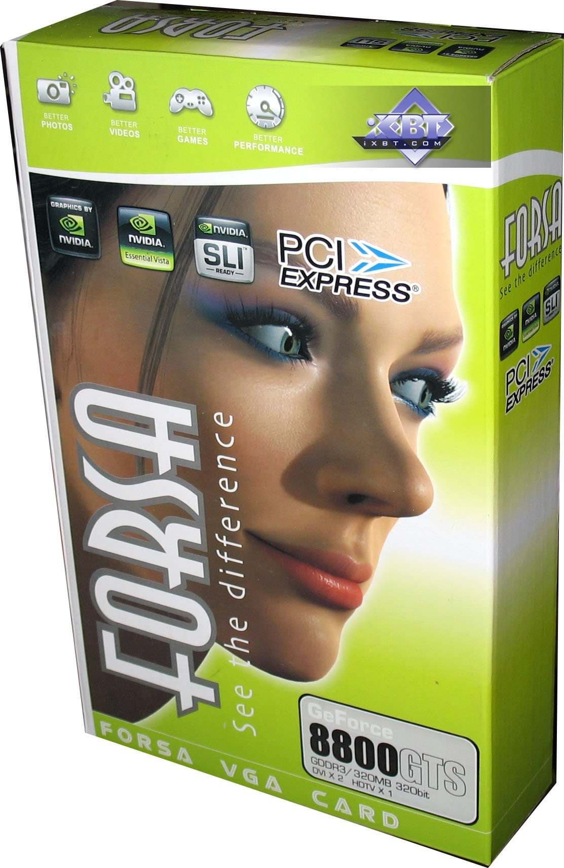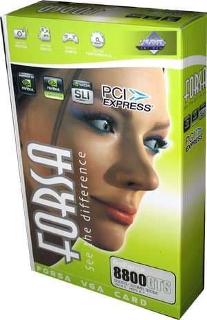 FORSA Geforce 8800 GTS 320MB PCI-E — рабочая лошадка из очень популярной серии видеокарт по цене около 300 долларов США. Все такие карты исполнены по заказу Nvidia на сторонних заводах, поэтому нет смысла расписывать каждую вариацию, которая отличается от своего аналога только наклейкой на кулере. В целом 8800 GTS 320MB из-за своей низкой цены и отличной играбельностью за такие деньги — очень популярен сейчас. И надо покупать просто то, что дешевле. Все равно внутри коробки вы найдете все ту же эталонную карту. Тесты все можно посмотреть в нашем материале по эталонному 8800 GTS 320MB.