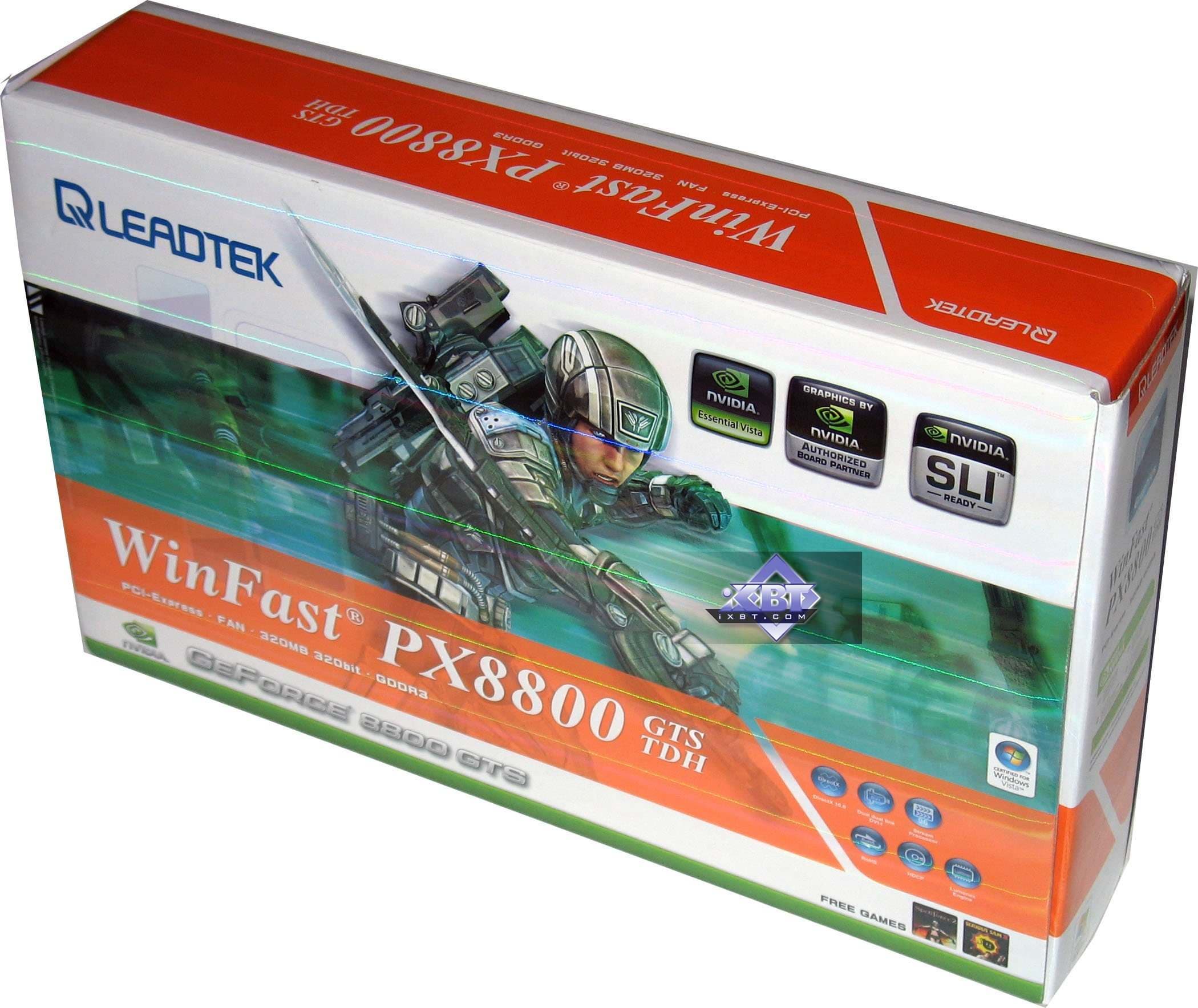 Leadtek WinFast PX8800GTS TDH 320MB PCI-E — не менее стандартный акселератора с обычными частотами. Наличие в комплекте поставки двух игр немного выделяет эту карту. Ну и еще следует упомянуть крышку от кулера собственного дизайна. Хотя это мало на что влияет. Только лишь эстетические качества.