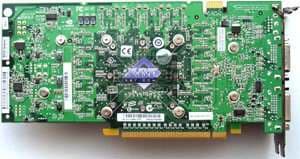 | Каждая карта имеет 320 МБ памяти GDDR3 SDRAM, размещенной в 10-ти микросхемах на лицевой стороне PCB. Микросхемы памяти Hynix (GDDR3). Время выборки у микросхем памяти 1,1 ns, что соответствует частоте работы 900 (1800) МГц. | ![]() |