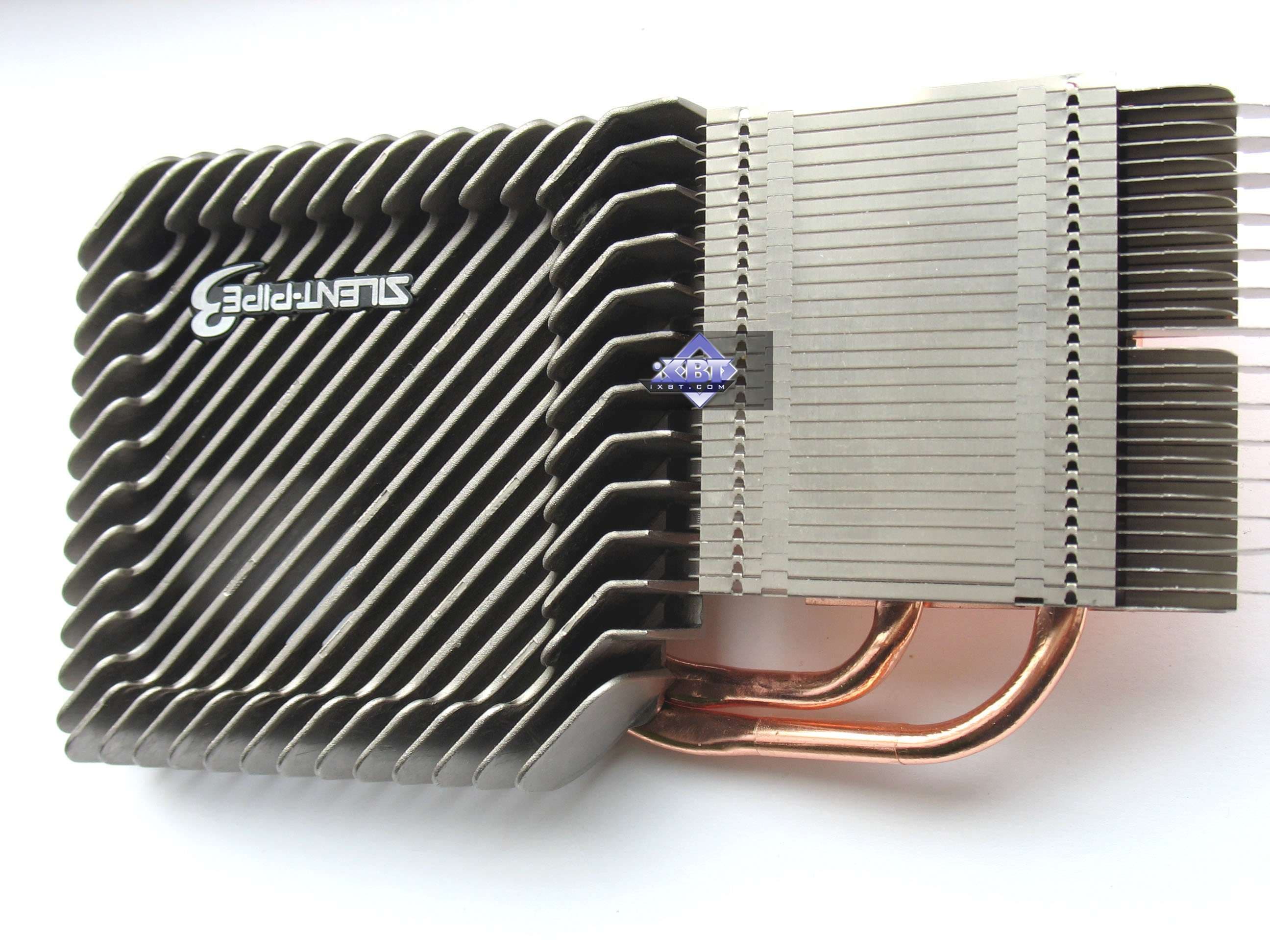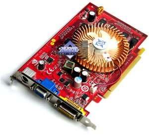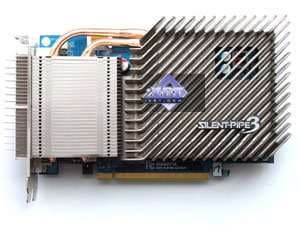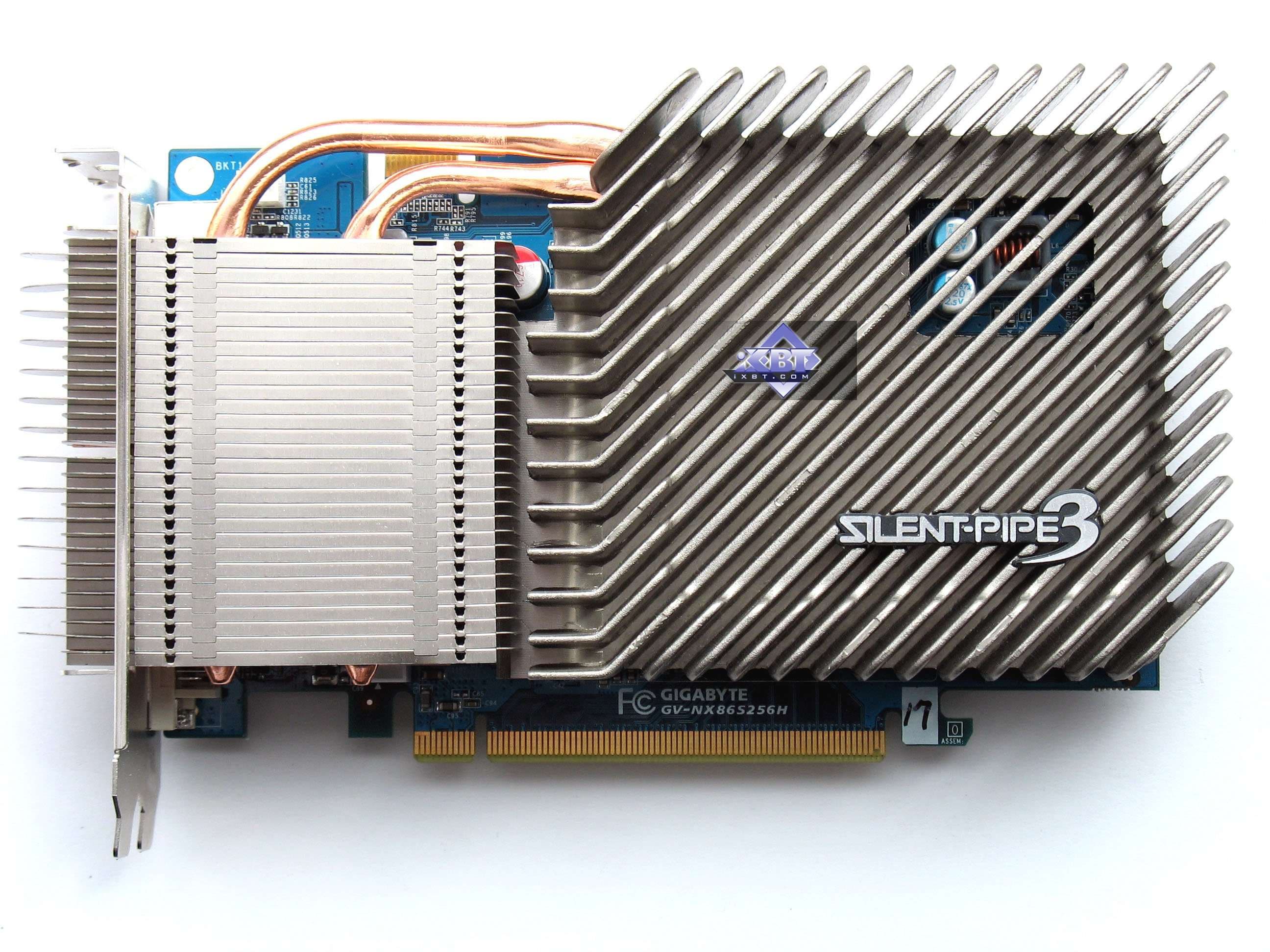 Gigabyte GV-NX86S256H Silent 256MB PCI-E — а это очень интересный продукт, плод деятельности инженеров из Gigabyte. К плюсам можно отнести наличие бесшумного кулера (который еще и эстетически красив), не требуется дополнительного питания. Двухслотовая система охлаждения, думаем, не является минусом, поскольку давно никого не волнует занятость следующего после PCI-E x16 слота. Эффективность кулера не вызывает сомнений, однако общий нагрев карты весьма велик, и нет вентилятора для развеивания скопления горячего воздуха над видеокартой, поэтому подобные продукты следует устанавливать в корпуса с хорошей продувкой, чтобы горячий воздух быстро выводился из системного блока.
