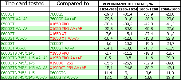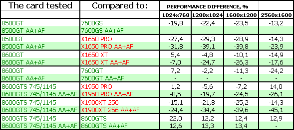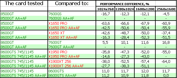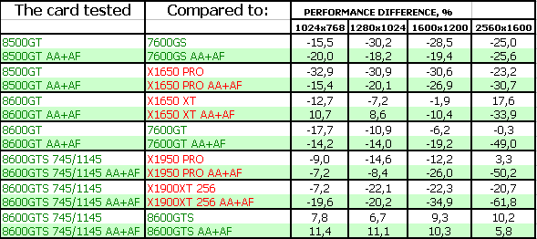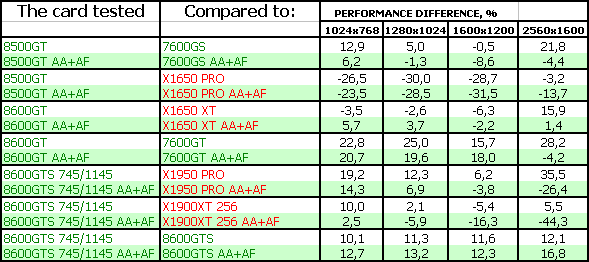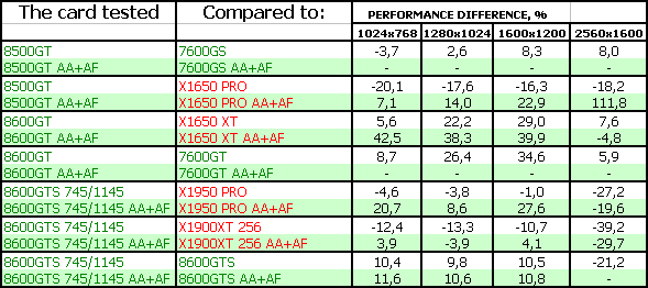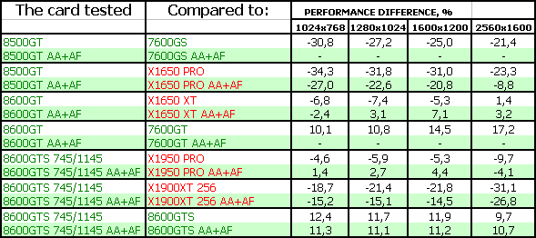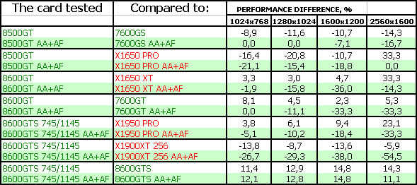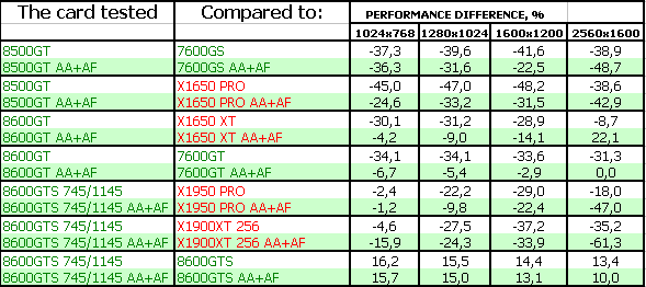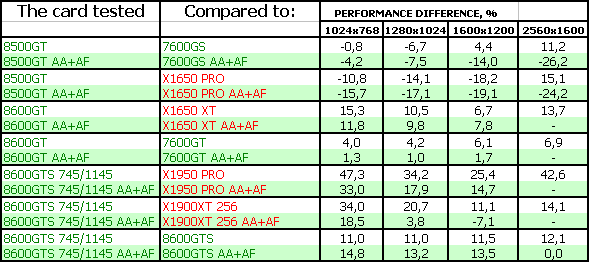 Поэтому мы можем сказать одно: для нынешних игр вполне достаточно RADEON X1650-серии, поскольку цена на такие карты сильно упала. Да и 7600GT/GS не так дороги, как были. Нет нужды в DX10-серии. Для будущих каких-то приложений — по сути, 8600GTS, который справится с такой нагрузкой без потери для качества, однако он еще весьма дорог. 8600GT — промежуточный вариант, надо каждому смотреть самостоятельно и взвешивать: частоты, цену.