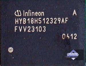 | Карта имеет 256 МБ памяти GDDR3 SDRAM, размещенной в четырех микросхемах на лицевой стороне PCB. Микросхемы памяти Infineon (GDDR3). Время выборки у микросхем памяти 1,3 ns, что соответствует частоте работы 750 (1500) МГц. | ![]() |