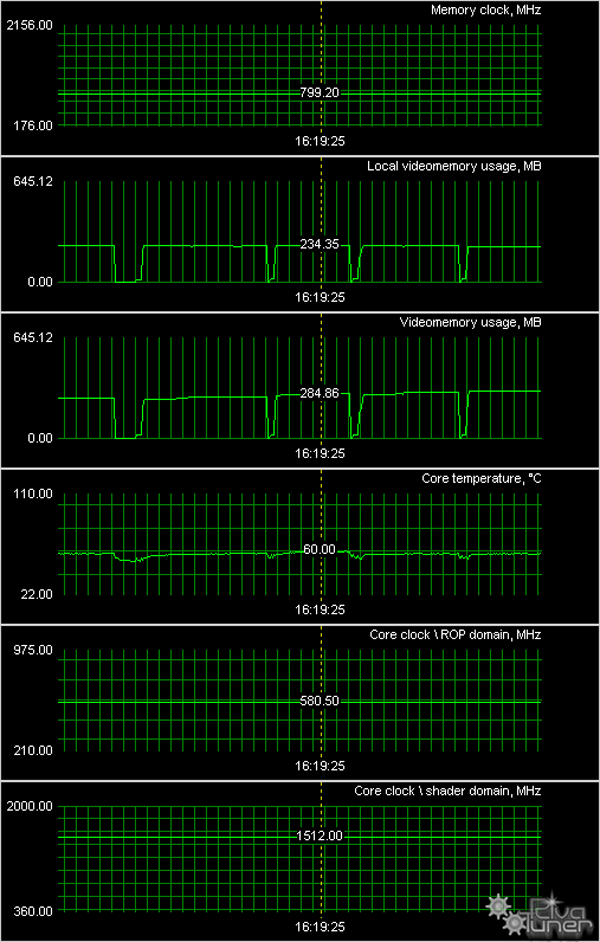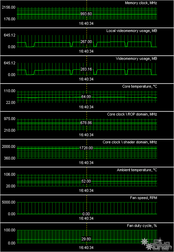 Мы провели исследование температурного режима с помощью утилиты RivaTuner (автор А. Николайчук AKA Unwinder) и получили следующие результаты:
