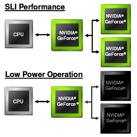 На схеме отображены два варианта работы SLI системы в HybridPower. Первый режим (сверху) используется при запуске 3D приложений, интенсивно использующих возможности установленных видеокарт Geforce 9800 GX2, которые работают в полную силу. Второй режим предназначен для повседневного использования и просмотра видео с аппаратным ускорением, в том числе. В этом случае используются мощности интегрированного в чипсет видеоядра, а установленные видеокарты могут быть выключены полностью, не потребляя энергии вовсе!