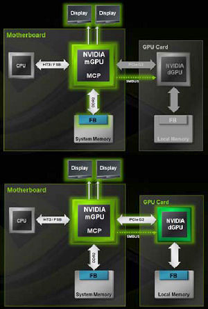 На схеме изображены два варианта работы SLI системы в HybridPower. Первый режим используется для повседневного применения, а также просмотра видео с аппаратным ускорением. В этом случае используются мощности интегрированного в чипсет видеоядра, а установленная видеокарта может быть выключена полностью. А второй режим предназначен для запуска 3D приложений, интенсивно использующих возможности установленной видеокарты, в таком случае она работает в полную силу.