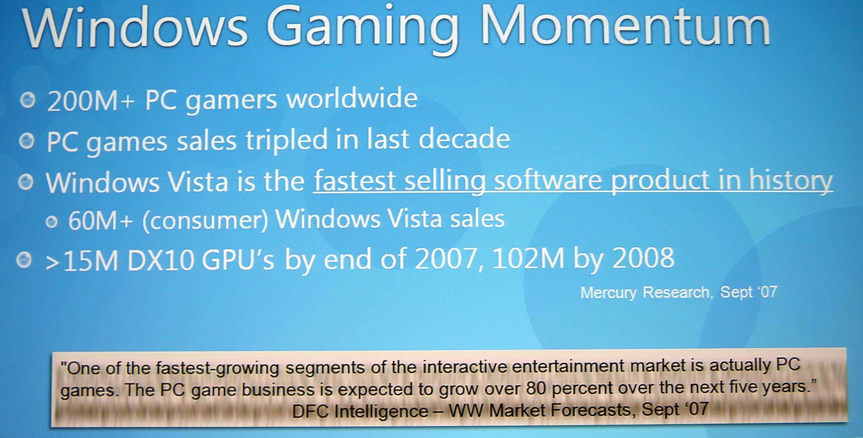 В подтверждение своих слов Кевин продемонстрировал слайд, из которого следовало, что объём продаж игр утроился за последнее десятилетие, а Windows Vista — самый быстро продающийся программный продукт в истории. Всё великолепие Vista и DX10 поддержат 15 млн. проданных до конца 2007 года графических процессоров (GPU), число которых к концу 2008 года должно вырасти до 102 млн.
