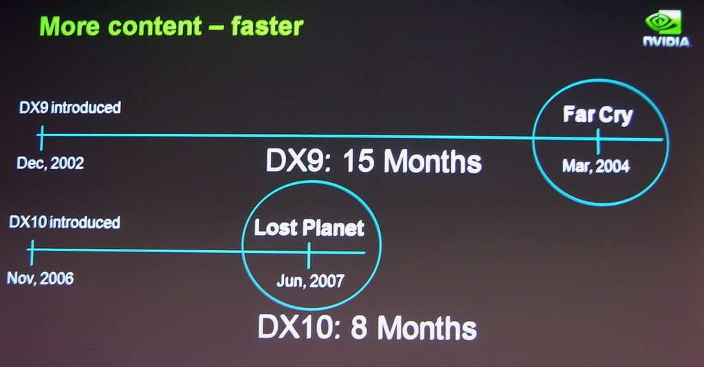 Технология DirectX 10, по мнению Тейлора, позволила в два раза быстрее создавать новый и качественный контент. Так, например, тогда как с момента анонсирования DirectX 9 в декабре 2002 года прошло более года до появления первой настоящей DirectX 9 игры, первую DirectX 10 версию «Lost Planet» мы увидели всего через восемь месяцев, в июне 2007 года.