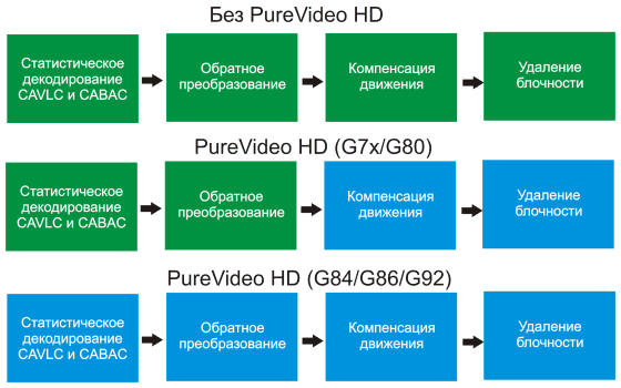 Голубым цветом выделены задачи, выполняемые видеочипом, а зелёным — центральным процессором. Старые чипы помогали процессору только в части задач, а новый видеопроцессор, применяемый во всех последних чипах Nvidia, делает задачи самостоятельно. Работа современных видеорешений была частично проверена в последнем материале по исследованию эффективности аппаратного декодирования видеоданных.