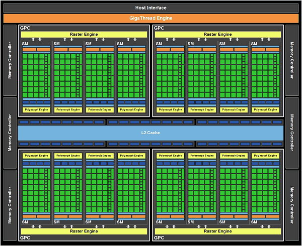 Итак, новый GPU в своем полном представлении содержит внешний PCI Express интерфейс, движок GigaThread, четыре GPC, шесть контроллеров памяти, шесть укрупненных блоков ROP, а также 768 КБ кэш-памяти второго уровня, присоединённые к блокам ROP.